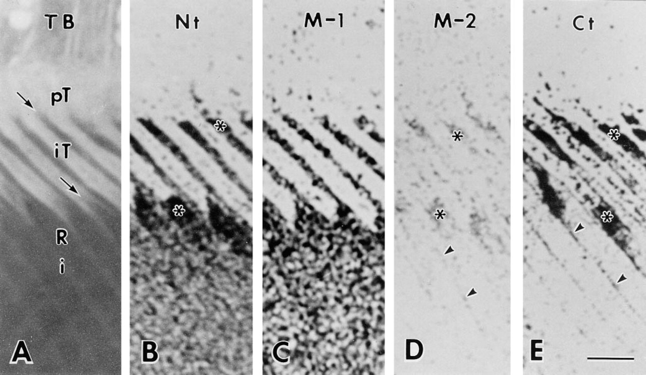 The five antibodies displayed characteristic staining patterns. There was no variation in the staining pattern among animals. Antibody Nt intensely stained the Golgi apparatus of the ameloblast and the enamel matrix. Over the enamel matrix, this antibody produced a decreasing gradient from the surface towards the dentino–enamel junction (Figure 2B). Antibody M-1 weakly stained the Golgi apparatus. Staining over the enamel matrix was intense and was similar to that produced by antibody Nt. However, in the middle- to innerlayer enamel, immunoreaction concentrated over the peripheral region of the enamel rod (Figure 2C). This staining pattern was clearer at the stage of outer enamel secretion (Figure 3B). Antibody M-2 stained the Golgi apparatus and the superficial layer of enamel matrix. The middle and inner layers were almost devoid of immunoreactivity (Figure 2D). Antibody M-3 stained the Golgi apparatus, but no reaction was found over the enamel matrix (Figure 2E). Antibody Ct intensely stained the Golgi apparatus of the ameloblast and immature enamel near the Tomes' processes. At the middle layer of immature enamel, the periphery of the enamel rod was also stained (Figure 2F). In addition to the Golgi apparatus and enamel matrix, antibodies Nt, M-1, M-2, and Ct occasionally stained small spherical bodies in the ameloblast. All the antibodies used stained neither dentin nor odontoblasts (Figures 2B–2F).