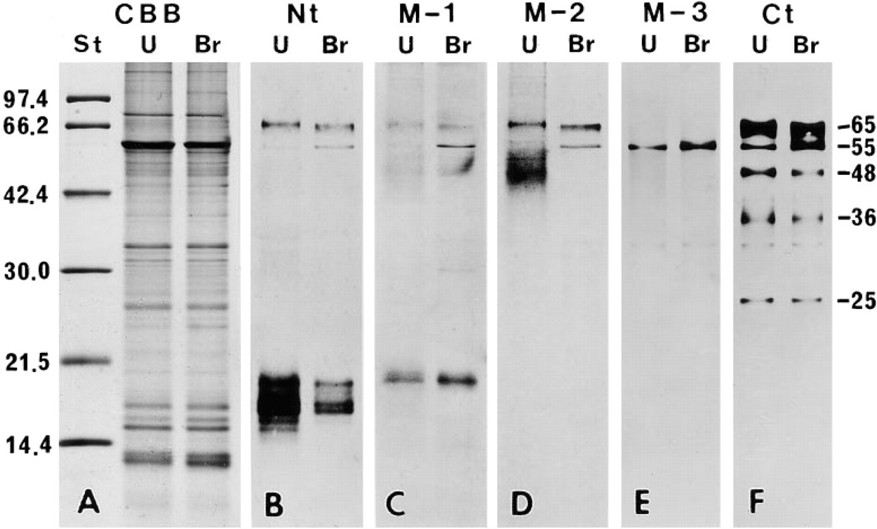 Because antibodies Nt, M-1 and M-2 were raised against BSA–peptide conjugates, they sometimes reacted faintly with rat serum albumin, which appeared as a protein band near 57 kD in immunochemical analyses under nonreducing condition. Therefore, these antibodies were preabsorbed with an excess amount of BSA before use. Antibodies M-3 and Ct did not react with rat serum albumin because they were generated against ovalbumin-peptide conjugates.