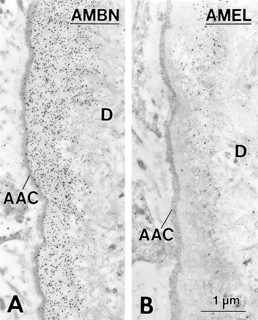 A knowledge of the nature and the origin of the first deposited matrix constituents along root dentin is of importance to elucidate the function of HERS in cementogenesis. In some animals, this matrix is believed to be formed in the presence of epithelial cells (Paynter and Pudy 1958; Slavkin 1976; Owens 1978,1980; Lindskog and Hammarström 1982; Glazman et al. 1986; Slavkin et al. 1988,1989; reviewed in Bosshardt and Schroeder 1996). Consequently, enamel-related proteins have been proposed as possible candidates (Slavkin 1976; Lindskog and Hammarström 1982; Glazman et al. 1986; Slavkin et al. 1988,1989; Luo et al. 1991). Because HERS cells do not appear to express mRNA for amelogenin (AMEL), the major enamel protein (Luo et al. 1991), interest has recently shifted to amelin/ameloblastin (AMBN), a novel enamel protein (Fong et al. 1996; Krebsbach et al. 1996). Although amelin mRNA is found in some cells scattered along the root (Fong et al. 1996), the presence and distribution of this protein in the extracellular matrices along the root are unknown.