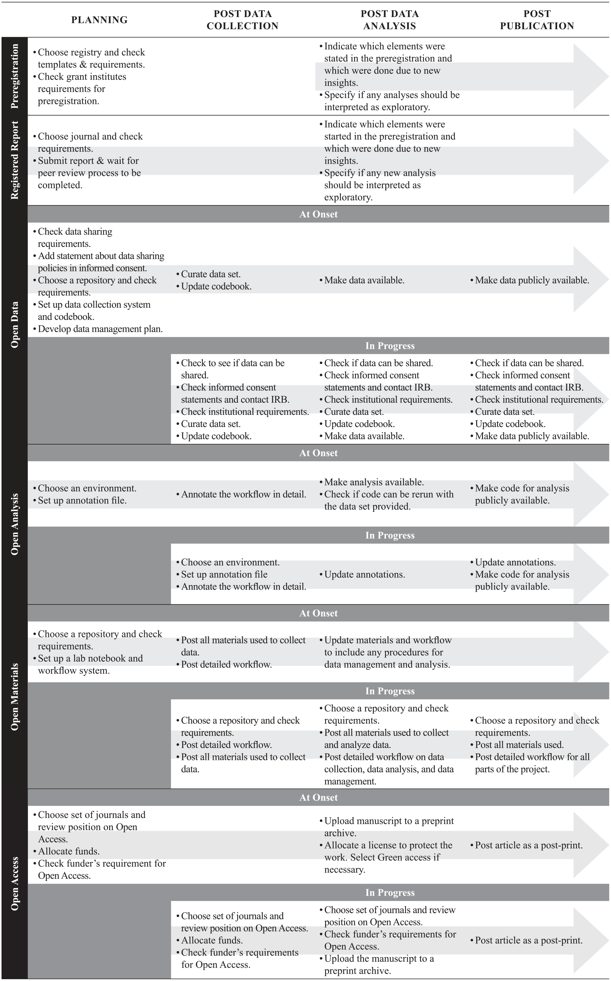 Flowchart of decision and actions to take at various stages of a research project for common elements of open science.