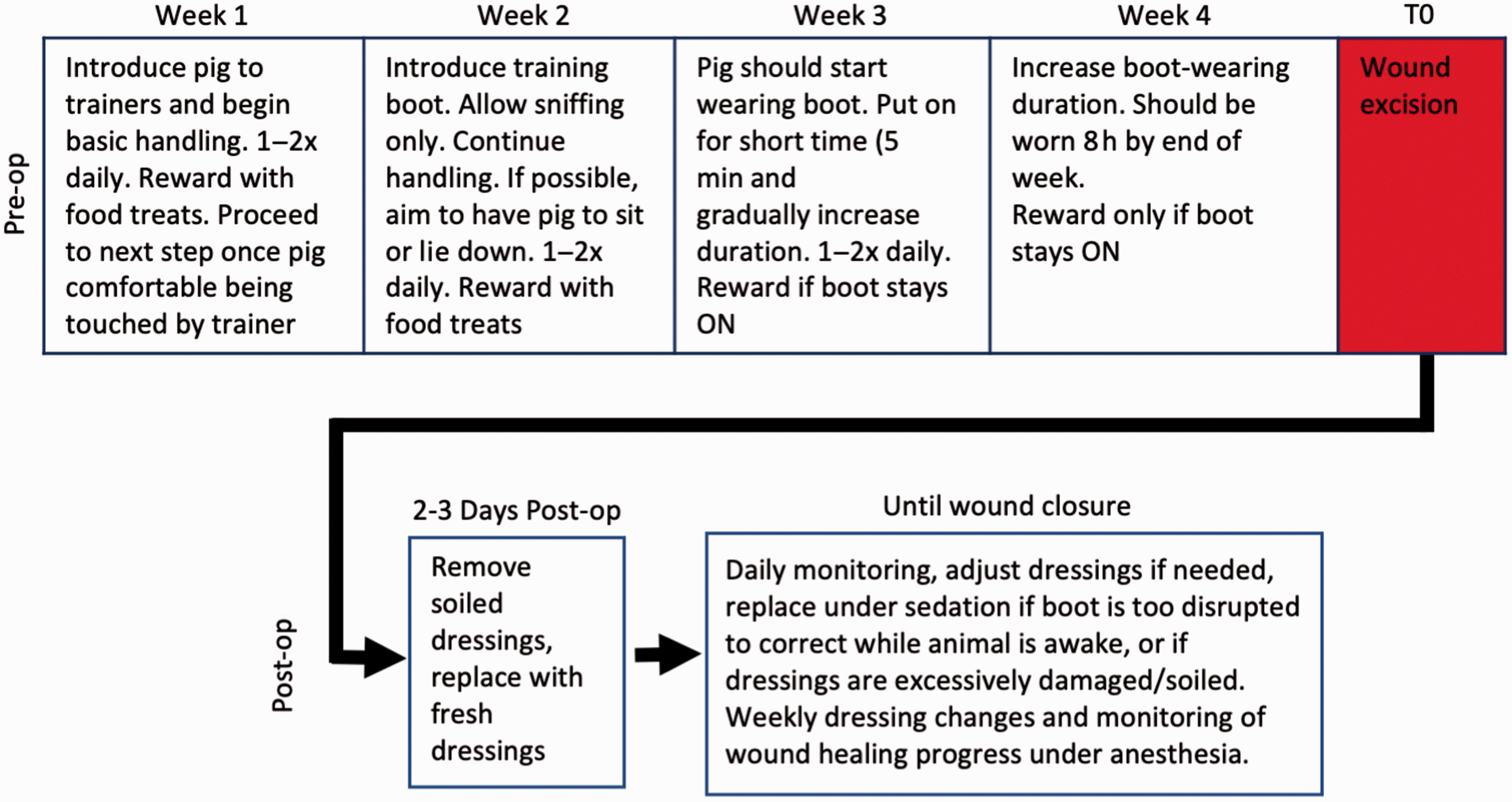 Flowchart for porcine plantar wound model. Protocol timeline for behavioral training and post-operation follow ups. The various phases of behavioral training should occur as depicted, but the timing should be adapted to each individual animal based on behavioral endpoints.