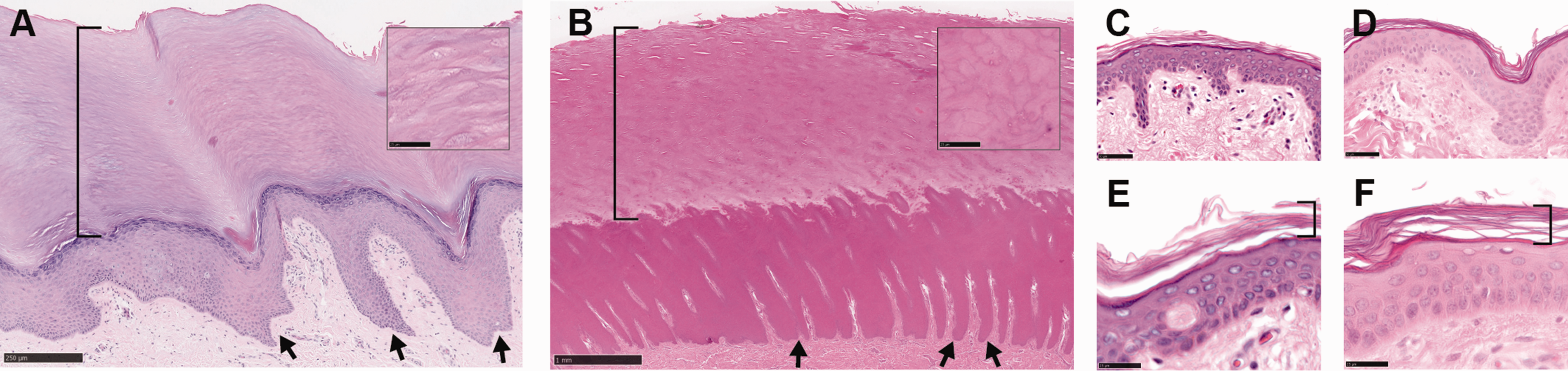 Plantar versus non-plantar skin histology in humans and swine. (a) Human plantar skin, showing distinctive features including prominent rete ridges (arrows) and a compact stratum corneum (bracket) that is thicker than the underlying viable epidermis. (b) Porcine plantar skin shows similar characteristics, with rete ridges and stratum corneum marked by arrows and bracket, respectively. Insets in (a) and (b) show the stratum corneum at higher magnification to better visualize the enlarged and tightly packed corneocytes. (c) Human abdominal skin. (d) Porcine skin overlaying the chest wall. (e) and (f) are high-powered views of the same skin types as shown in (c) and (d), respectively, with the stratum corneum marked by brackets. Note in non-plantar skin the much thinner viable and cornified epidermal layers, reduced interdigitation between dermis and epidermis, and the loosely layered corneocytes in the stratum corneum. Scale bars: (a): 250 µm; (b): 1 mm; (a) and (b) insets: 25 µm; (c) and (d): 50 µm; (e) and (f): 25 µm.