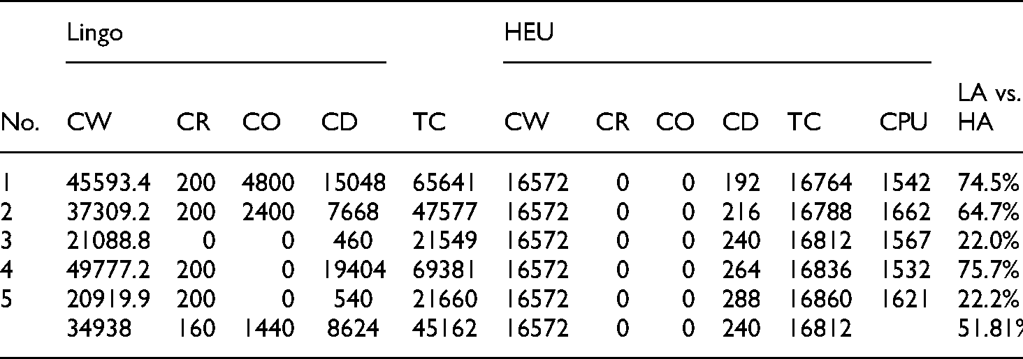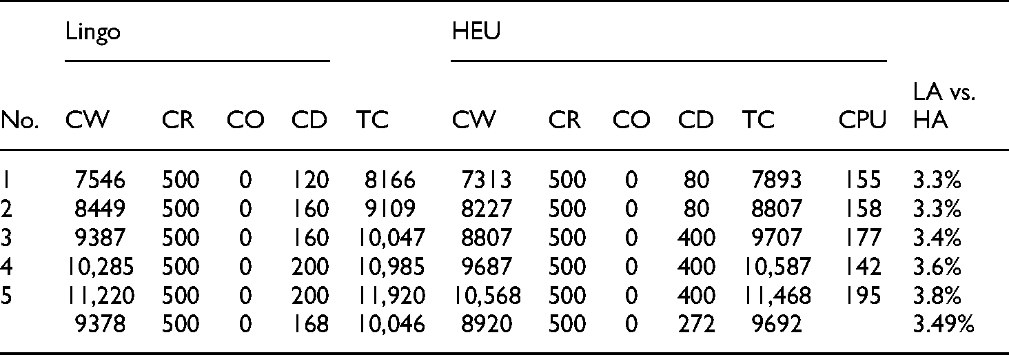 All five types of problems were solved through Lingo optimization and HGA. The computational results of the five problem types are shown in Tables 5–9, in which the percentage gap of the TC between Lingo and HGA was given by the formula of (LS-HS)/LS, where symbols LS and HS stand for the TC of Lingo method and the TC of HGA method, respectively.