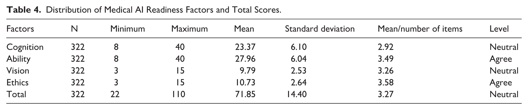 In order to determine medical students’ levels of readiness for medical artificial intelligence, the distribution of the scale factor scores and the total score were examined and the results are presented in Table 4.