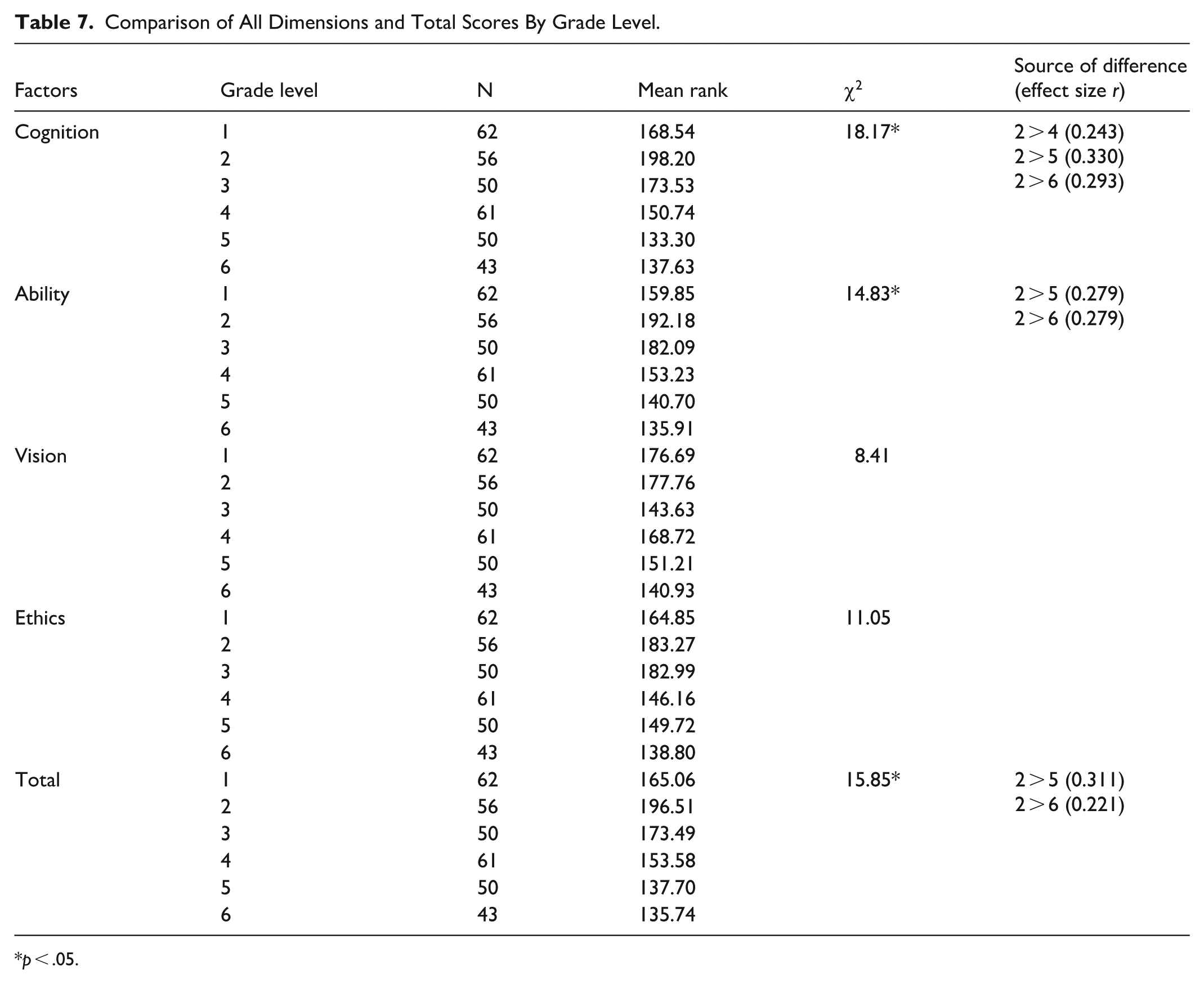 In order to determine whether there was a significant difference between levels of medical AI readiness according to grade level, the distribution of the scale factor scores and the total score were examined according to grade level, and it was determined that none of them met the assumptions of normality. Therefore, the Kruskal-Wallis test was conducted, and in cases of significant difference, the Mann-Whitney U test was performed with Bonferroni correction to determine the source of the difference. The results are presented in Table 7.