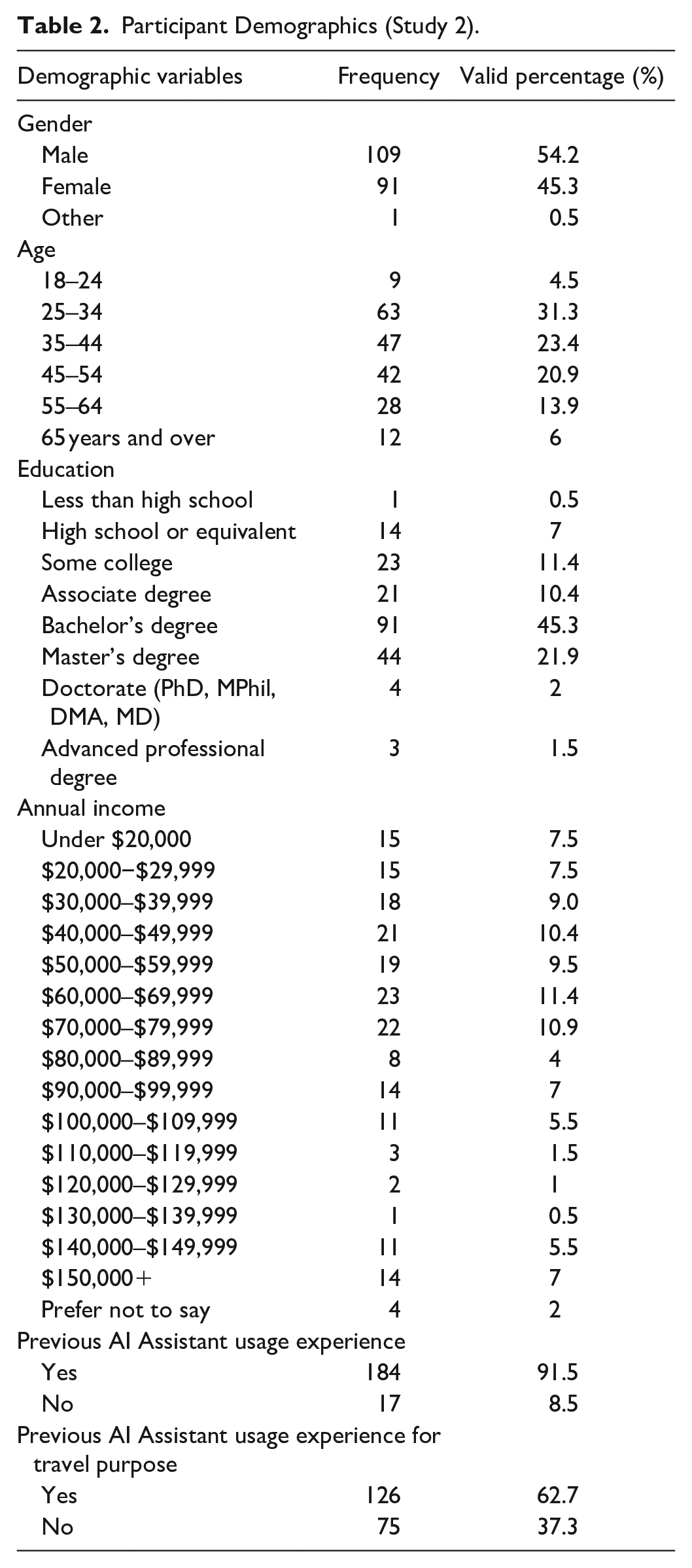 This procedure yielded a total of 201 usable observations after the deletion of incomplete and unqualified responses. Of these, 54.2% of them were male. In total, 184 participants (91.5%) had used at least one type of AI assistant in the past, and more than half of participants (62.7%) had used AI assistants for travel purposes. Table 2 presents the participants’ demographics.