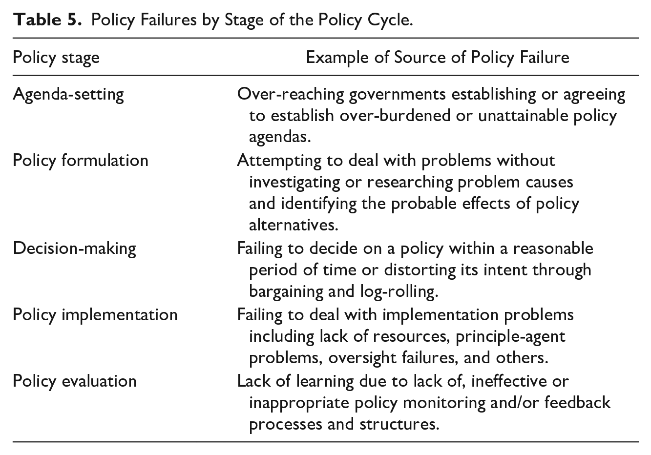Similarly, these kinds of failures may originate in different kinds of government activity, as McConnell (2010a and 2010b) noted. Searching for the causes of these different kinds of failures should note not just their politics, process and problem orientation but also that these kinds of problems may originate at different points in the policy process (see Table 5). That is some failures originate immediately in the agenda-setting process while others emerge later due to problems encountered in formulation or decision-making, while others are linked to implementation or evaluation (Howlett et al., 2020) (See Table 5).