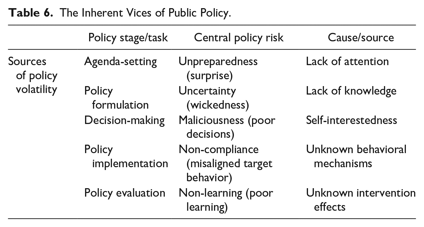 Such vices—“unpreparedness,” “uncertainty,” “maliciousness,” “non-compliance,” and “non-learning”—can also usefully be organized according to the stage of policy-making they most affect (Howlett, 2000; Lang, 2019) (see Table 6). Each is an potentially important source of policy failure which injects volatility into policy-making and, as such, each should properly be well within the purview of studies of policy learning (Howlett & Mukherjee, 2019 and 2017).
