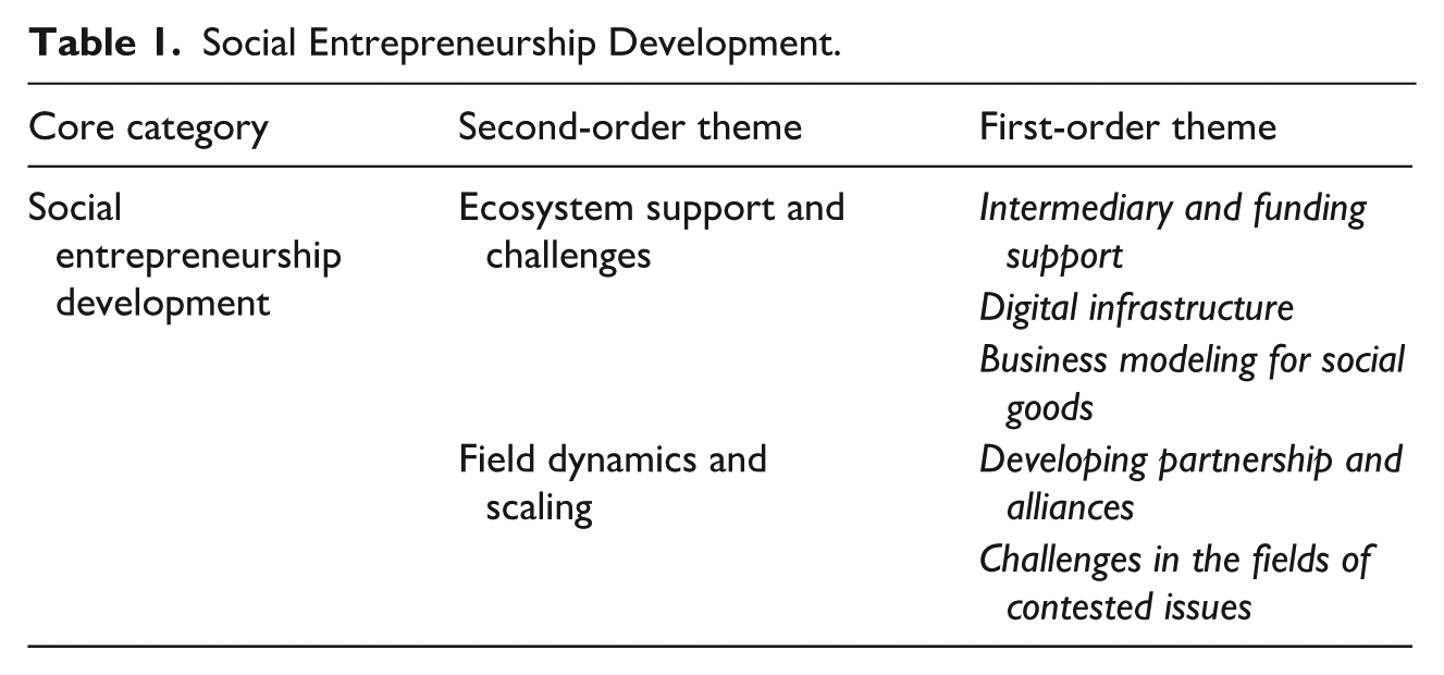 Third, our analysis of the critical incidents followed the sequence of open, axial, and selective coding (Aguinis & Solarino, 2019; Corbin & Strauss, 2014). We began by identifying an initial set of salient concepts, particularly those related to ecosystem elements, entrepreneurial activities, and challenges. Through axial coding (highlighting relationships among the open codes), we identified categories of key social entrepreneurial activities at the early stage of project development, ecosystem support, challenges faced in scaling (see Table 1). Finally, selective coding linked the analysis back to the research questions. This helped us develop propositions about ecosystem approaches to social entrepreneurship development.