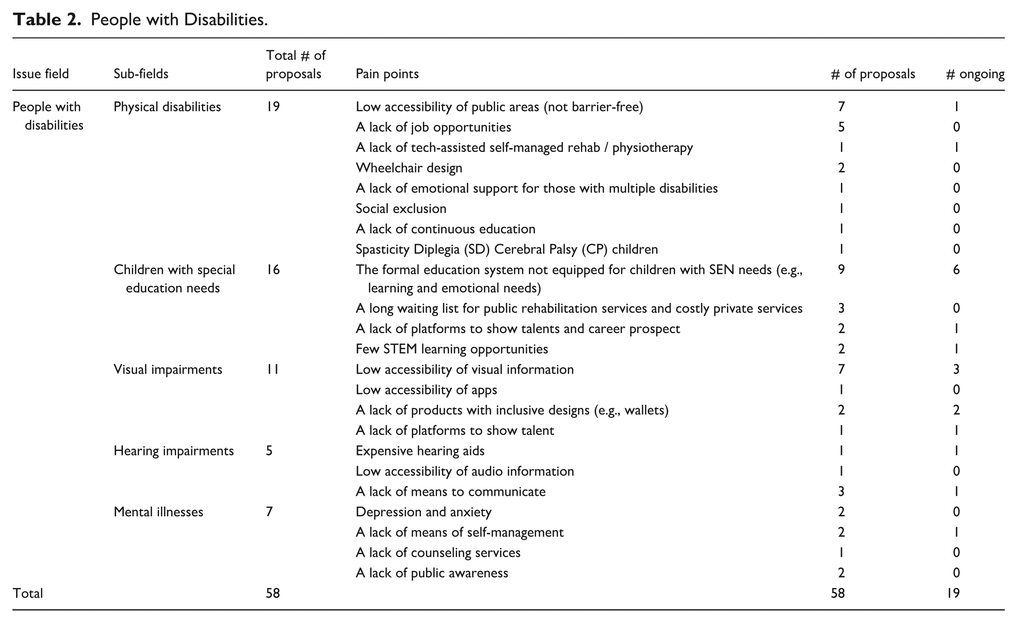 In the PWDs issue field (Table 2), the ongoing projects were those that promoted inclusive place designs (e.g., barrier-free), education (e.g., for children with SENs), products (e.g., wallets for people with visual impairments), and services (e.g., audio-description services). None of the five projects (
