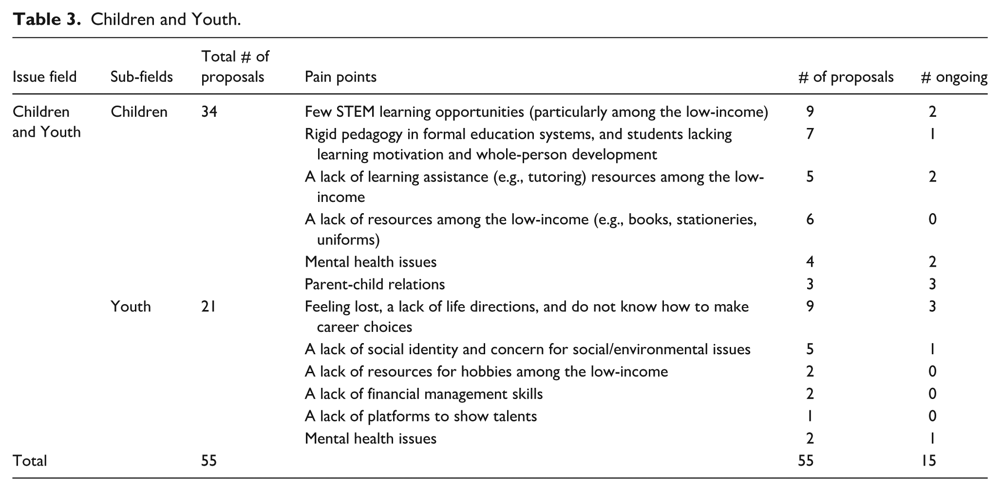In the issue field for children and youth (Table 3), the continuing projects were those that worked on parent-child relations and children’s mental health issues, provided STEM (science, technology, engineering, and math) learning opportunities and after-school learning assistance, and supported youth in their self-discovery journey and making career choices. However, despite many submissions, fewer projects offering alternative education continued.