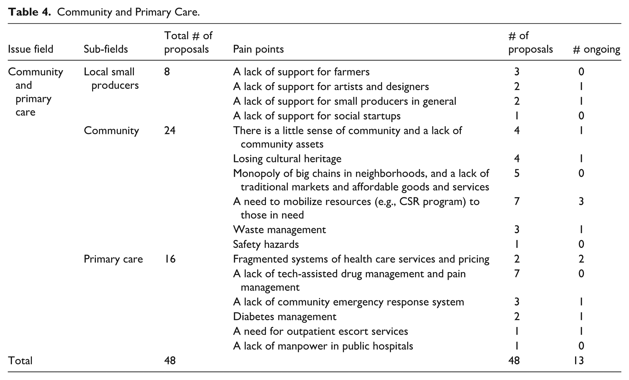 Turning to community and primary care (Table 4), the continuing projects were those that provided matching platforms between providers (e.g., space, services, helping hand, funding, other in-kind resources) and those in need (e.g., small businesses, community residents). Such platforms (e.g., community flea markets) were inclusive markets where marginalized users could access affordable goods and services. Although many startups (e.g., community cultural tours) sought to strengthen local residents’ local identity and sense of belonging to their communities as well as support local small businesses, only two of the 13 projects) were still operating at the time of interviews.