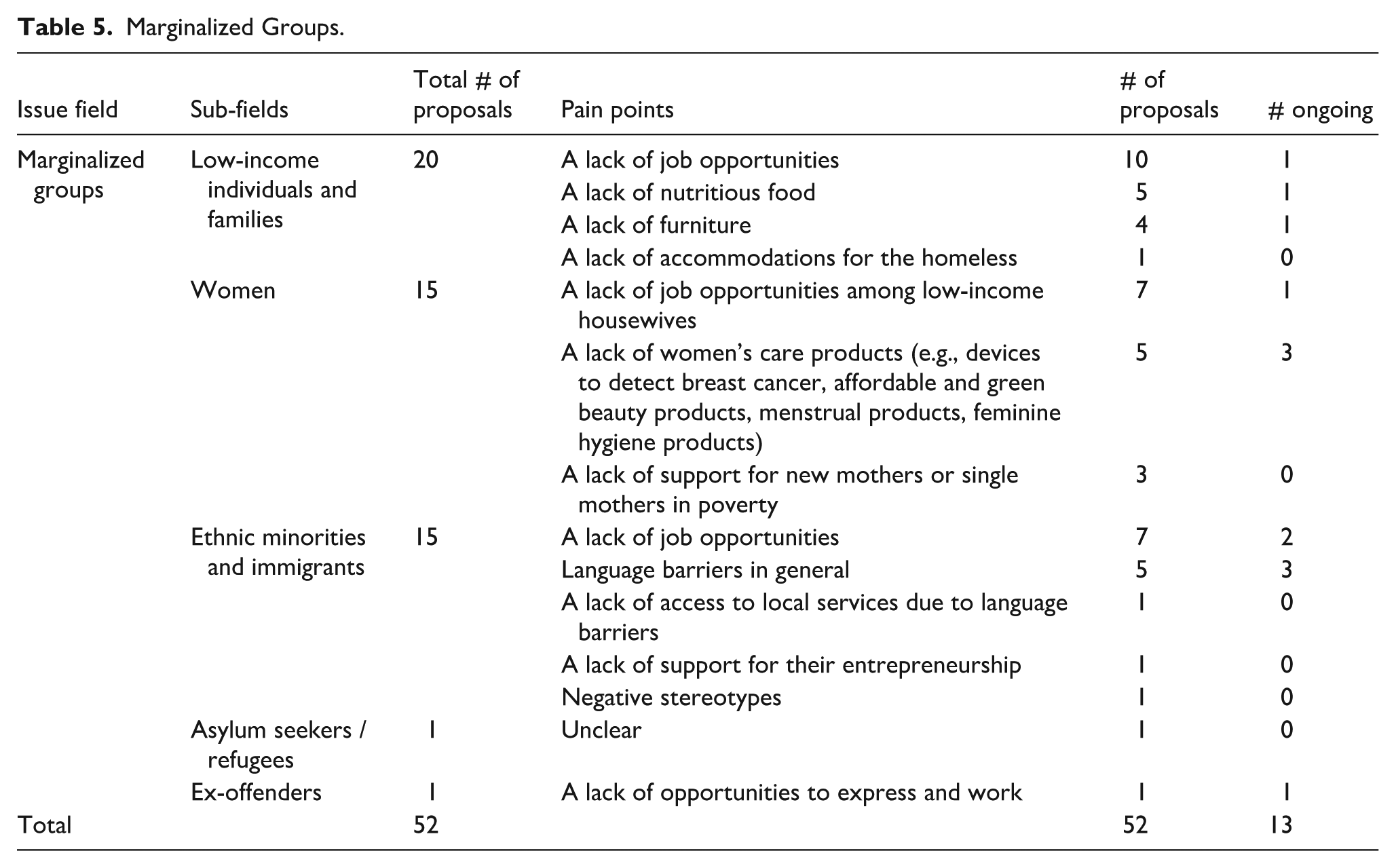 Second, to denote issue fields, we created second-order categories based on the main sectoral concerns from the social startups for the 15 target beneficiary groups. For example, the main sectoral concerns among social startups for children and youth were education and development; for people with disabilities they were social inclusion and employment. The second-order categories were children and youth, older adults, PWDs (including children with SENs), marginalized able-bodied groups (e.g., working poor, ethnic minorities, immigrants), and community and primary care. Then, we compared the number of busines proposals submitted in the five issue fields as well as the number of surviving projects in each field at the time of the interviews. This provided insight into how institutional dynamics in different issue fields could have affected scaling of social innovation.