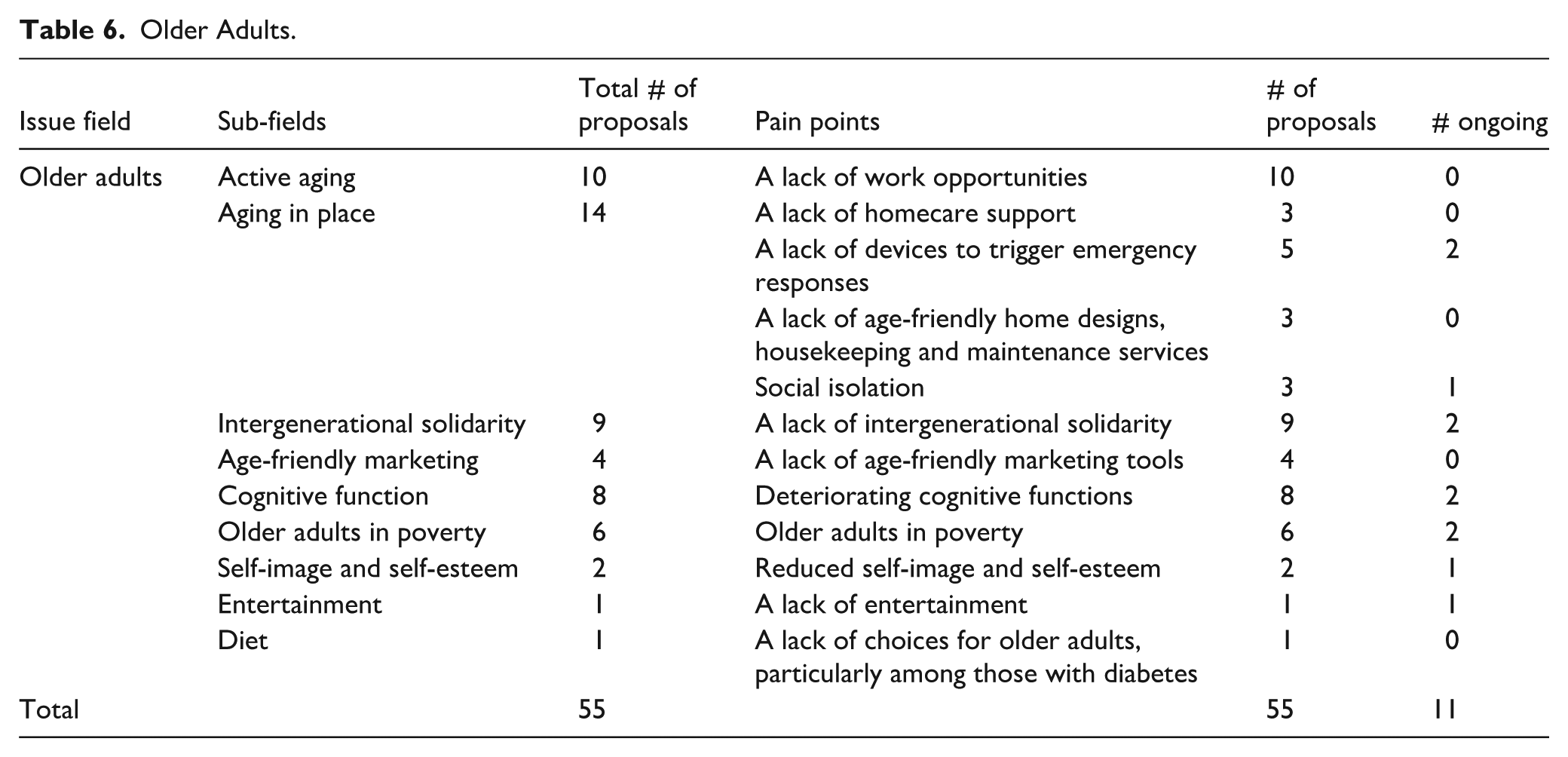 Finally, in the issue field for older adults (Table 6), despite strong messages encouraging active aging and aging at home, many startups that aimed to provide job opportunities for older adults and create age-friendly homes (e.g., safety devices, housekeeping services, diet, homecare) did not continue. The only exceptions were those working on devices that trigger emergency responses. Intergenerational solidarity was a popular agenda in Hong Kong, and 2 out of 7 projects were still operating at the time of interviews. Those aiming to delay cognitive deterioration among elders and to help older adults in poverty with specialist medical care and daily necessities such as food also survived. Four other startups tried to provide age-friendly e-commerce for older adults confronting difficulties finding services and products had not survived by the time of the interviews.