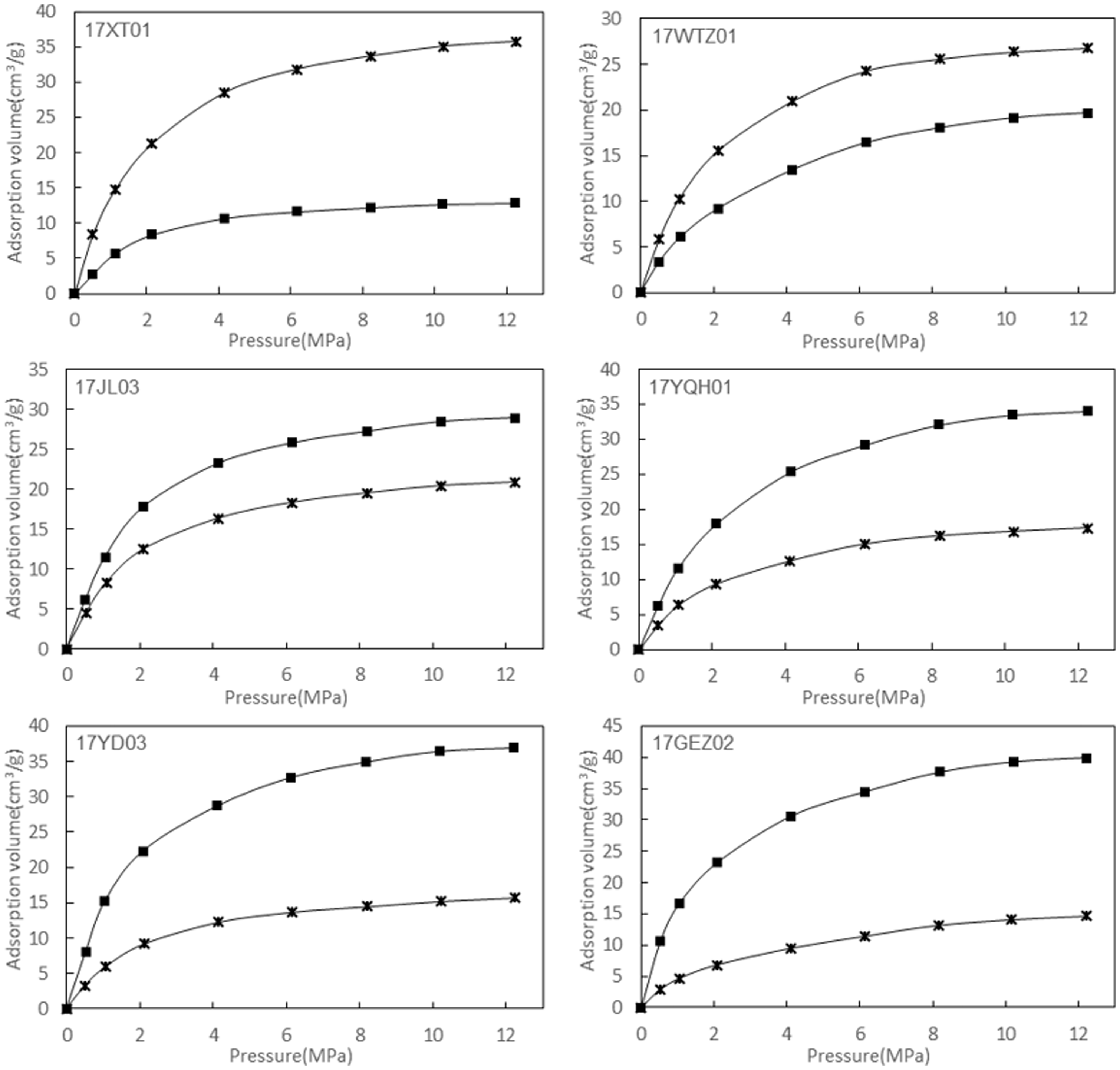 In the state of equilibrium moisture, the moisture content of vitrinite and inertinite of 17XT01 is 4.63% and 4.68%, respectively. The moisture contents of vitrinite and inertinite of the other five samples are similar; they are between 3.53% and 3.94%. The results of isothermal adsorption experiments show that with the rise of pressure, the adsorbed volumes of vitrinite and inertinite of all the samples increase. While the rates of increase and the ultimate adsorption volumes are different (Figure 1). Look through all the samples, along with increase of metamorphic grades, the ultimate adsorption volumes of vitrinite increase from 12.88 cm3/g to 39.95 cm3/g gradually and the ultimate adsorption volumes of inertinite decrease from 35.73 cm3/g to 14.64 cm3/g gradually (Figure 1).