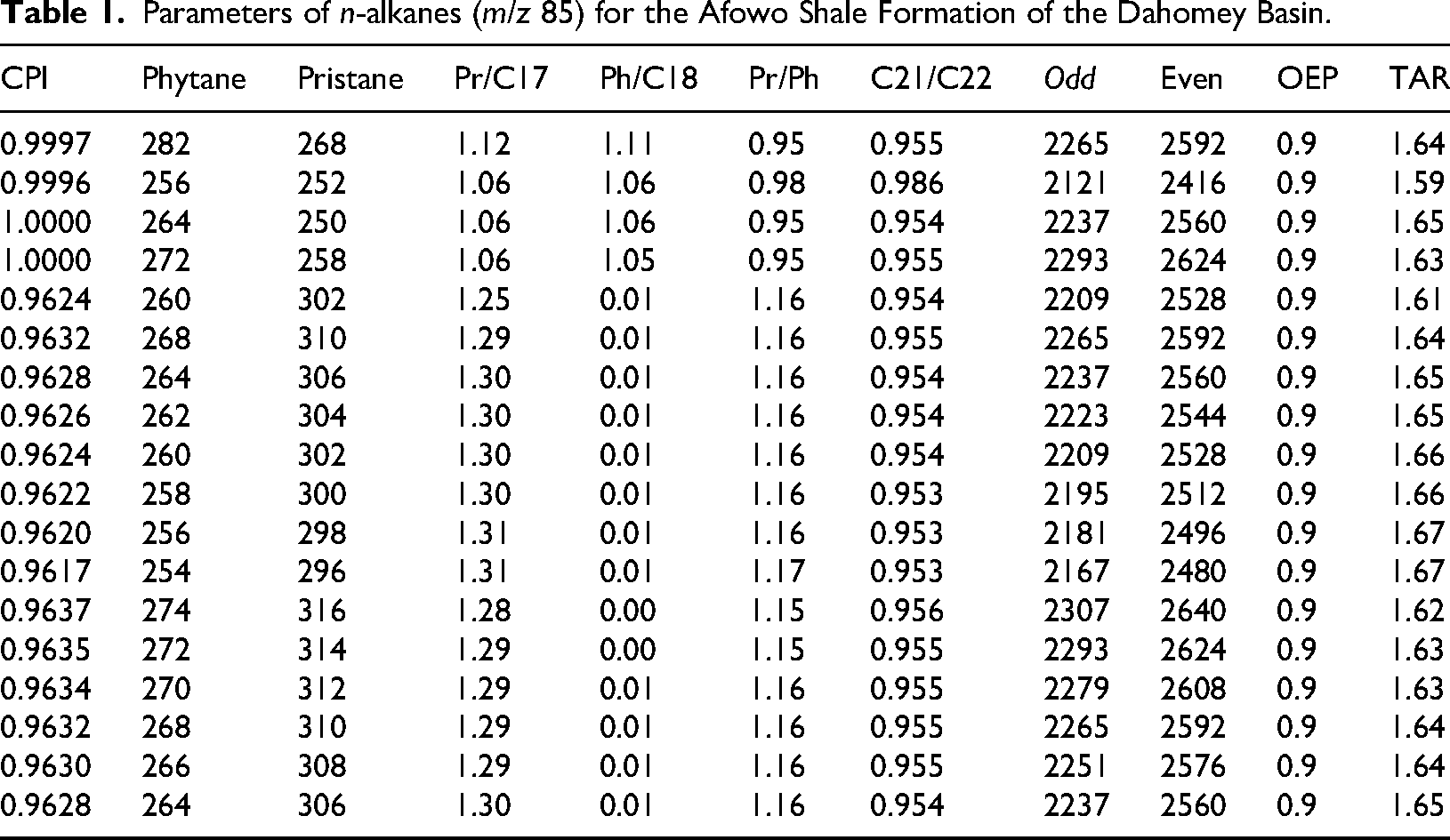 A total of 32 samples were collected from the Afowo Shale Formation to a total depth of 100 m, exposed by streams and channels. The samples were pulverized and prepared for various analyses. GC-MS analysis was conducted on representative 18 samples from the study area. Approximately 80 g of powdered shale samples (<200 mesh) were extracted using a dichloromethane/methanol mixture (93:7) for 77 h in the Soxhlet apparatus. Elemental sulphur was removed by activated copper during extraction. The whole extract analysis of saturated and aromatic fractions was analysed on an Agilent 7890A Olympic-02 Gas chromatograph (GC) interfaced with an Agilent 5975C mass selective detector. The GC was fitted with a 60 m × 0.25 mm fused silica capillary column coated with a 0.25-μm film. The oven was programmed at an injection temperature of 40°C with an initial hold time of 1 min. The temperature was increased at 3°C/min to 330°C and kept isothermal for 35 min. Ultra-high-purity helium was used as a carrier gas and maintained at a constant flow of 1.1 mL/min. An Agilent 5973 mass selective detector (MSD), interfaced with the GC, was operated at 70 eV and a source temperature of 230°C with mass spectra acquired in full scan mode at about four scans per second. The relative concentrations in gas chromatography and mass fragmentations were determined based on peak heights.