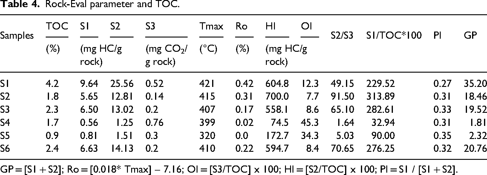 GP = [S1 + S2]; Ro = [0.018* Tmax] – 7.16; OI = [S3/TOC] x 100; HI = [S2/TOC] x 100; PI = S1 / [S1 + S2].