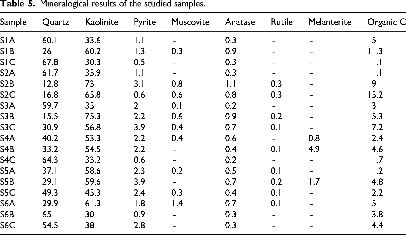The XRD result reveals the presence of organic carbon, kaolinite, pyrite, muscovite, anatase, rutile, and melanterite, as shown in Table 5. The Afowo shale is predominated by kaolinite minerals (30–75.3%, averaging 50.0%), contributing to a greater abundance of micropores and reduced adsorption capacity of gas content to the pore surface. The relative abundance of quartz ranges from 12.8% to 61.8%, averaging 41.9%, suggesting easy formation fracturing during enhanced production. The presence of organic carbon (1.1–15.2%, averaging 5%) indicates the preponderance of varied organic matter in the shale. The pyrite mineral ranges from 0.5% to 3.9%. averaging 2.0%, indicating a sulphide-reducing paleoenvironment. Intense pyritization of the Afowo shale horizons is common and suggests an age range extending into the Maastrichtian age (Falufosi and Osinowo, 2021). Melanterite minerals barely occur in the shale, while muscovite, anatase, and rutile occur in small amounts, averaging at 0.5%, 0.5%, and 0.2%, respectively.