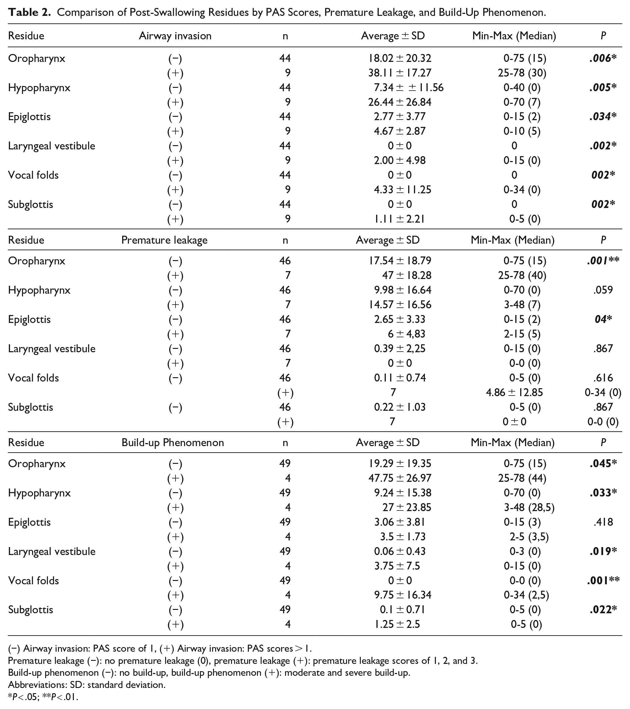 Comparison of Post-Swallowing Residues by PAS Scores, Premature Leakage, and Build-Up Phenomenon.