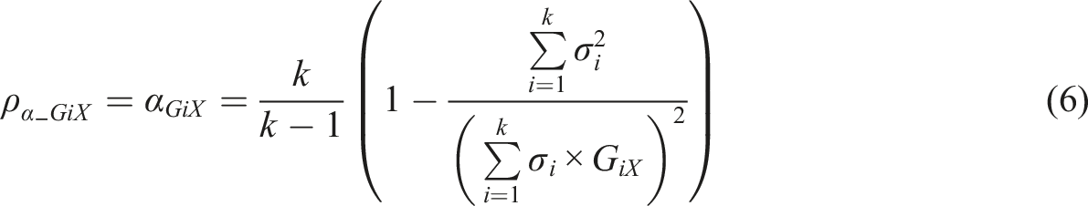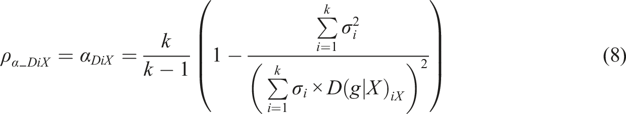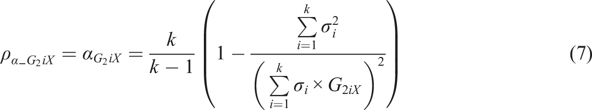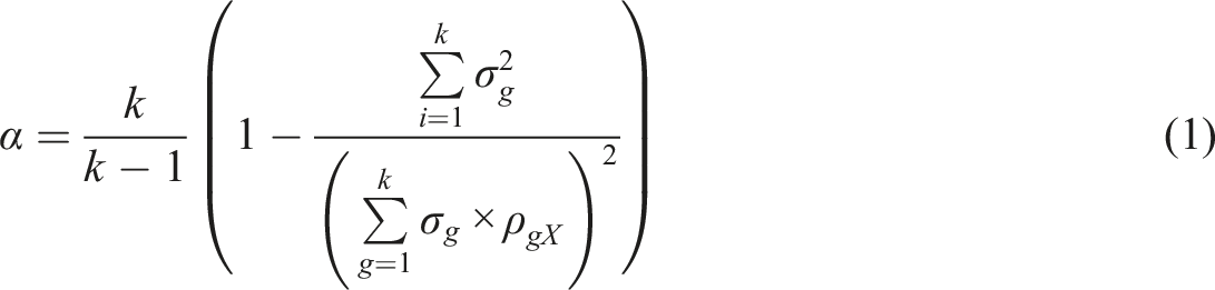 Let us denote a general weight factor between an item gi and the latent variable θ by wi. If we apply the estimator based on alpha (equation (1)), select the raw score (X) as the manifestation of θ, and vary wi, a theoretical form of MCERs based on the formula of alpha is . Selecting leads us to the traditional alpha while some MCERs based on different estimators of correlation can be based on RPC, G, G2, D, and D2