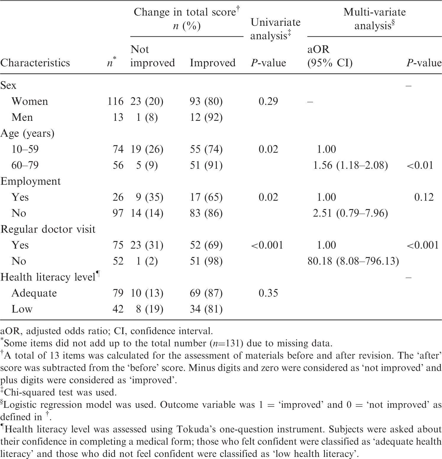 This study found that feedback assessment respondents who were elderly and did not have regular doctor visits were more likely to notice improvement in the materials. One nationwide survey in Japan reported that the elderly were less confident about seeking health information (Ishikawa et al., 2012). Their vulnerability to access information could be enhanced by advancing technology. Another national survey among the elderly in the USA found a negative loop between low health literacy and use of the internet; elderly people with low health literacy tend not to use the internet to obtain health information and are left behind in the digital information age (Levy et al., 2014). This does not only affect elderly people; as Protheroe et al. (2009) wrote, ‘a person can be literate within a familiar environment and context, but functionally illiterate when required to comprehend and respond to unfamiliar vocabulary and concepts in an unfamiliar environment’. Healthcare settings are unfamiliar environments for many, and universal precaution is key to promoting health literacy at health organisations (Brega et al., 2015). This training programme showed that one way of reaching out to populations at risk of not receiving health information is to train health professionals to have a health literacy perspective and skills.