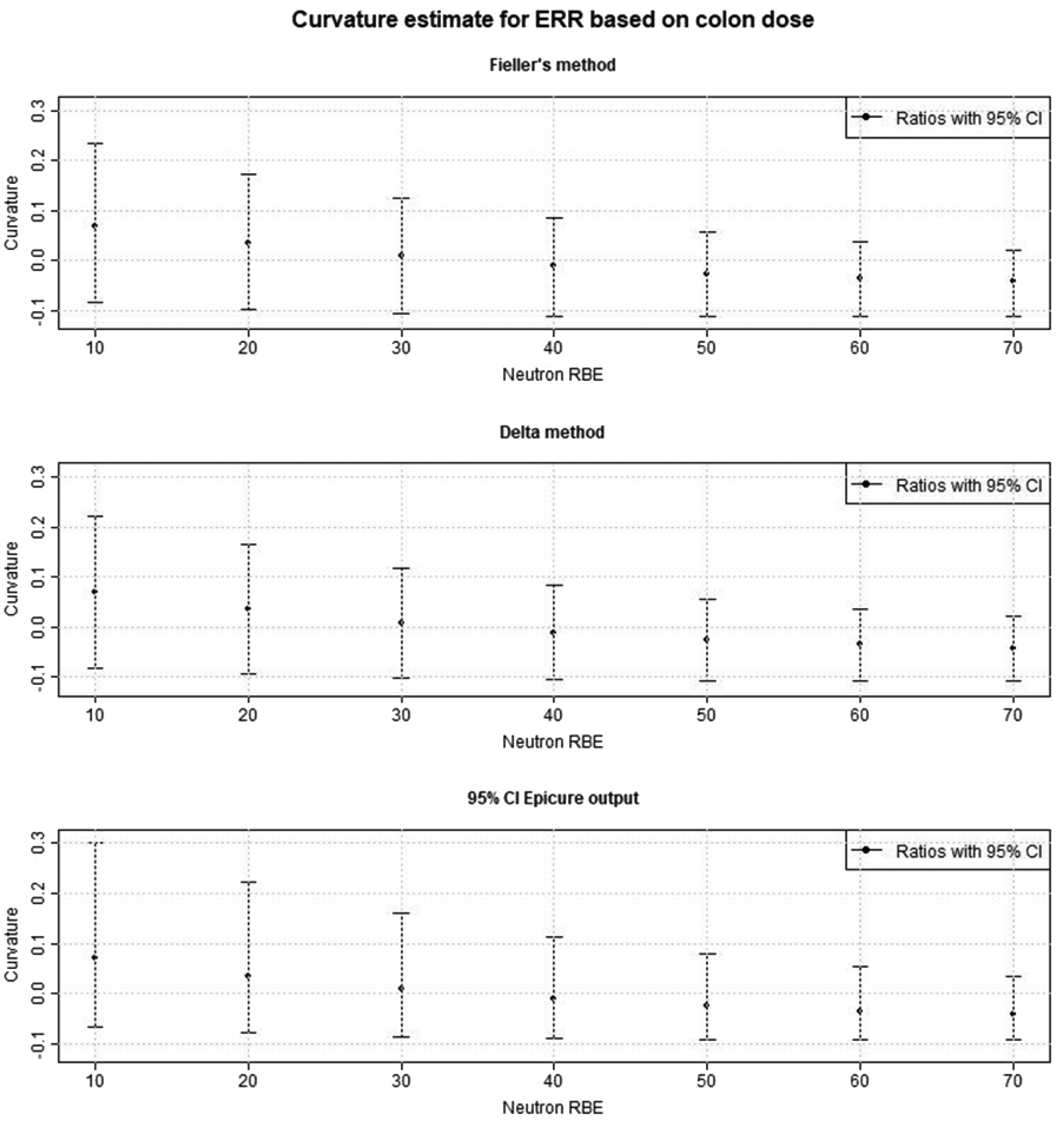 In Fig. 1, the curvature of the dose–response curve is shown as a function of neutron RBE with respect to colon dose. The 95% CIs are calculated using three different methods: Fieller’s method, the Delta method, and using the profile likelihood bounds from Epicure. The 95% CIs resulting from Fieller’s method and the Delta method are almost the same, whereas the profile likelihood bounds from Epicure are larger, especially for the lower RBEs. When the RBEs get higher, the differences get smaller.