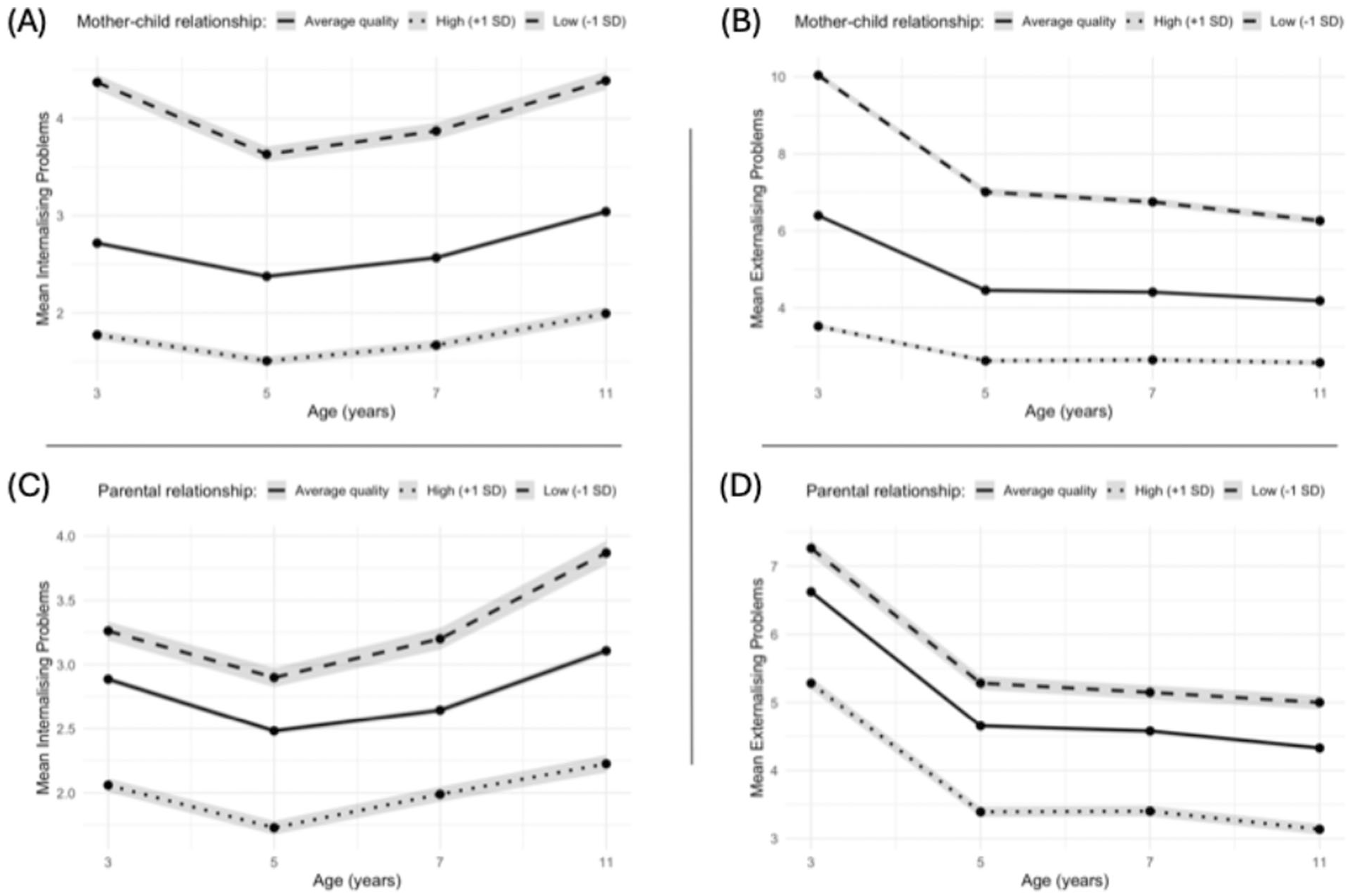 Mean Scores of Internalising and Externalising Difficulties From Ages 3 to 11 Years Stratified by the Quality of Early-Life Family Relationships. (a) Mean internalising (