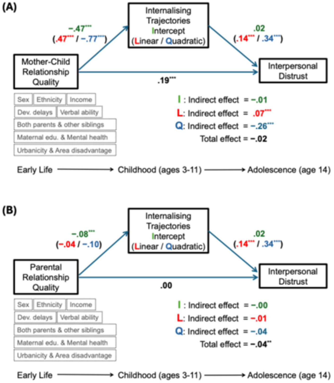 As before, there was a positive direct association between higher mother–child relationship quality and distrust (standardised