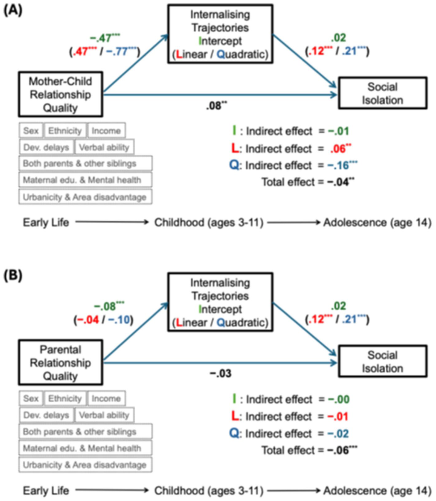 In the models using internalising symptom trajectories as the mediator, the quality of the mother–child relationship displayed opposite-signed mediation through the linear and quadratic growth factors. Specifically, better mother–child relationship quality was associated with a slightly steeper linear increase in internalising from ages 3 to 11 (yielding a positive indirect effect on adolescent distrust and isolation), but also with a more negative quadratic curvature (i.e., a greater deceleration or rate of decline of these problems towards late childhood, yielding a negative indirect effect). It is important to note that a higher linear slope increased risk for adolescent interpersonal distrust and social isolation – as would be expected, since increasing internalising difficulties over time predict poorer social outcomes – whereas a more negative quadratic slope decreased risk, reflecting improvement in symptoms towards later childhood, that is, a protective effect. In fact, the quadratic (protective) pathway predominated, resulting in a small net protective mediation for social isolation and a near-zero net mediation for distrust. This pattern suggests that developmental change proximal to adolescence – specifically, a steeper decline in internalising symptoms by late childhood – may represent a key mechanism linking the quality of early mother–child relationship quality to adolescent interpersonal distrust and perceived social isolation.