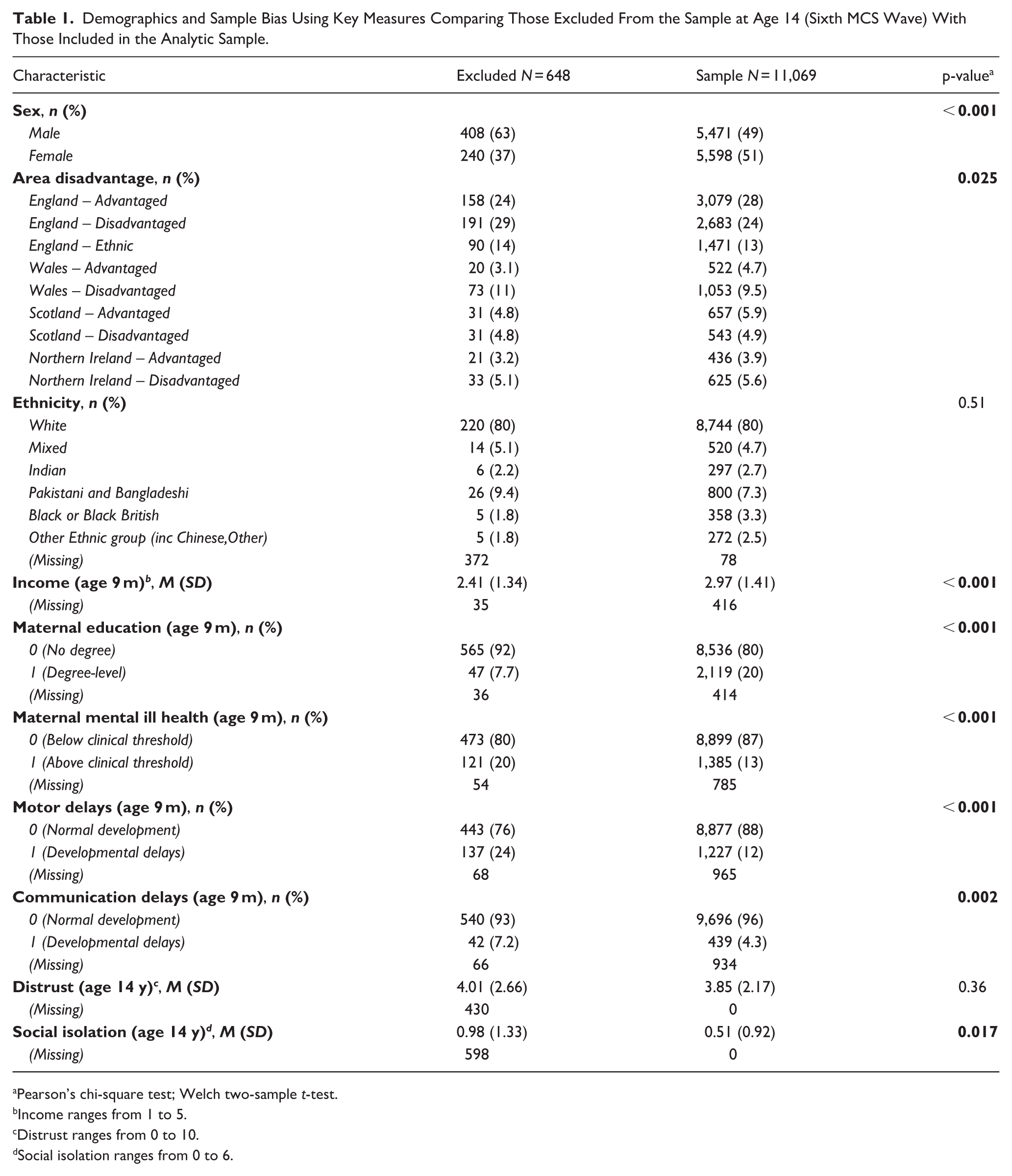 At the age 14 survey sweep, more than 11,800 adolescents took part in the survey (data collection took place between January 2015 and March 2016). Our analyses included 11,717 cohort members who were singletons or first-born twins or triplets and were further restricted to those with complete data on the outcomes (distrust and low social support). As a result, the final sample included 11,069 adolescents (51% female, 20% non-White; 44% living in disadvantaged areas). Further details on the demographic profile of included and excluded participants (with a sample bias analysis) are provided in Table 1. We note that full information about the study variables, methodology, and the complete code output of all statistical analyses can be found in the Supplemental Online Material (SOM, 2025).