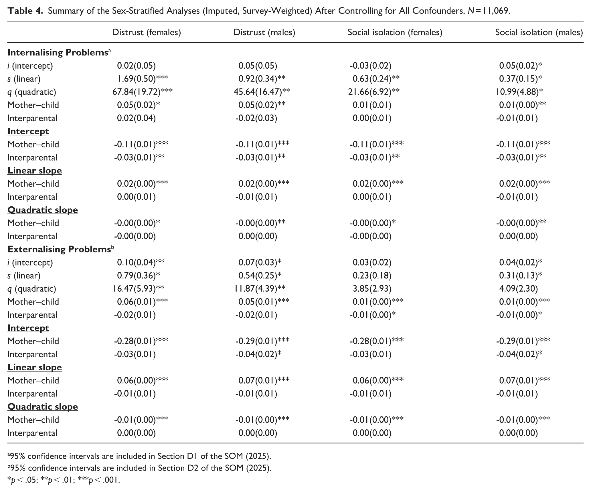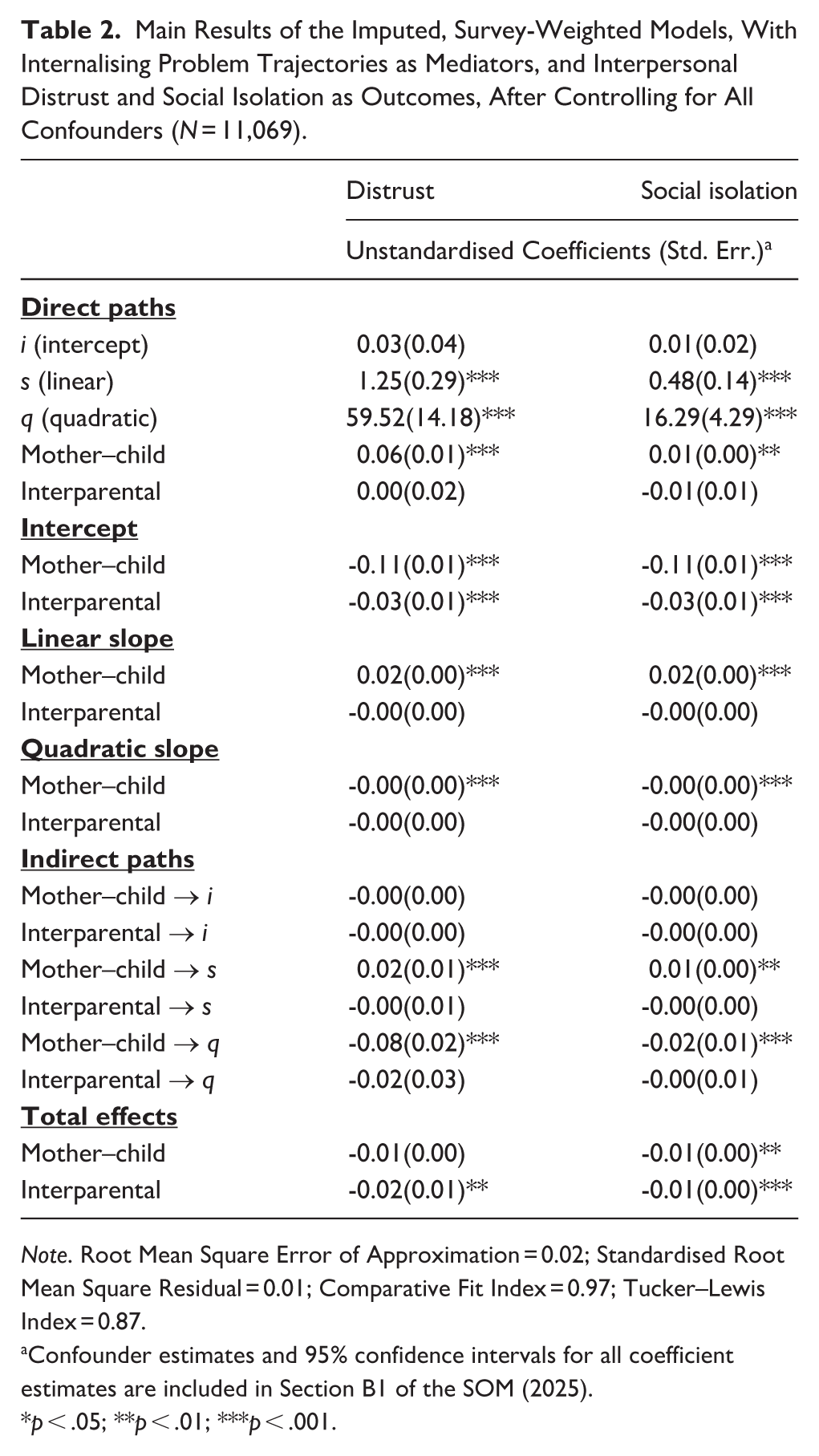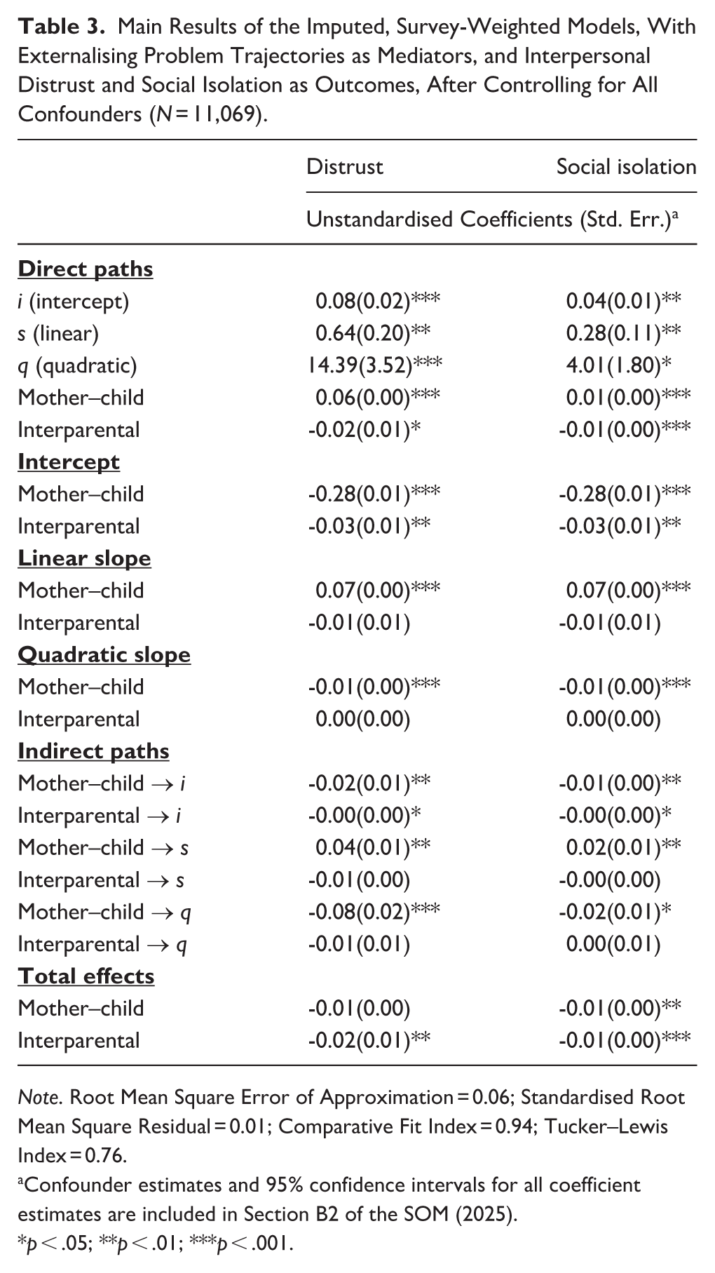 Table 3 summarises the main findings for both distrust and social isolation (full details in SOM, Section B2). The intercept, linear slope, and curvature of externalising problem trajectories were all significantly positively associated with subsequent distrust and social isolation (standardised effects from 0.11 to 0.27).