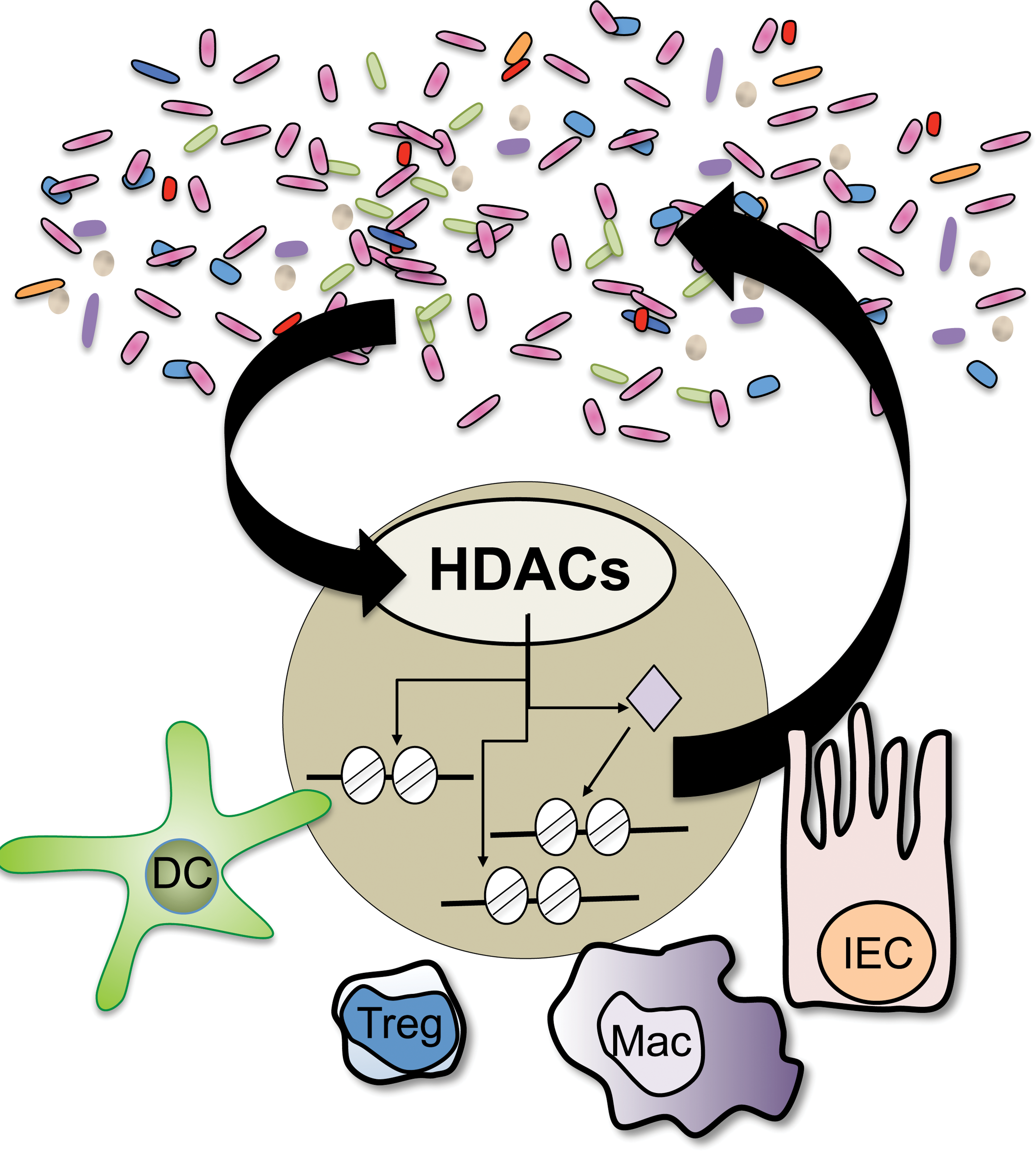 Recent studies indicate that histone deacetylases (HDACs), a family of epigenomic-modifying enzymes, mediate dynamic regulation between the microbiota and multiple cell lineages in the mammalian intestine. Manipulation of these pathways may result in altered intestinal homeostasis and susceptibility to inflammation, as well as changes in the diversity of the microbiota.