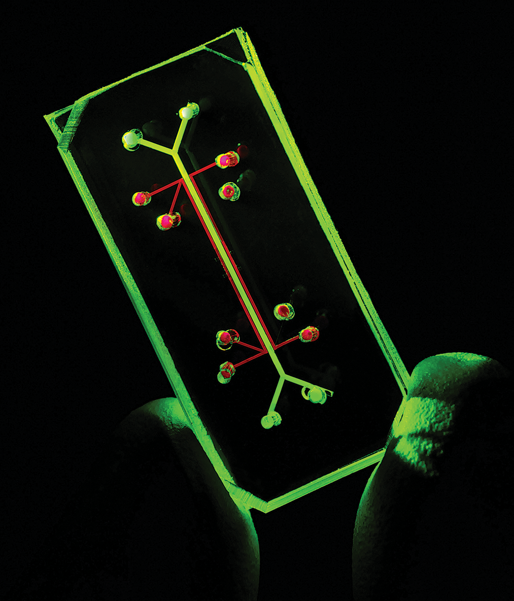 One of the pioneering microphysiological systems devices was the lung-on-a-chip. Using fluorescence light, the microfluidic input and output ports are highlighted here in red and green, respectively. These supply the functional portion of the chip which has two microchambers separated by a porous membrane. Human lung alveolar epithelial cells line one chamber and capillary endothelial cells line the other and mimic the air–fluid interface of the alveolus. Two air-filled chambers are next to the alveolar and endothelial cell chambers and provide the vacuum necessary to direct the biomechanics (expansion and relaxation of “breathing”) for the membrane between the two chambers. Courtesy of the National Center for Advancing Translational Sciences.