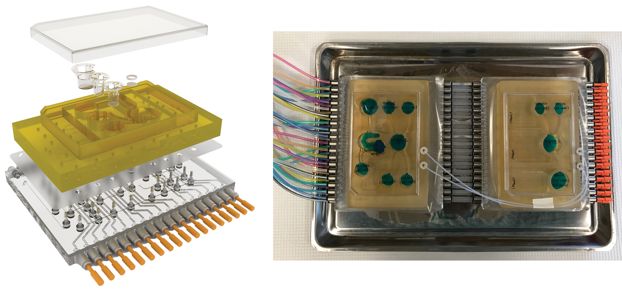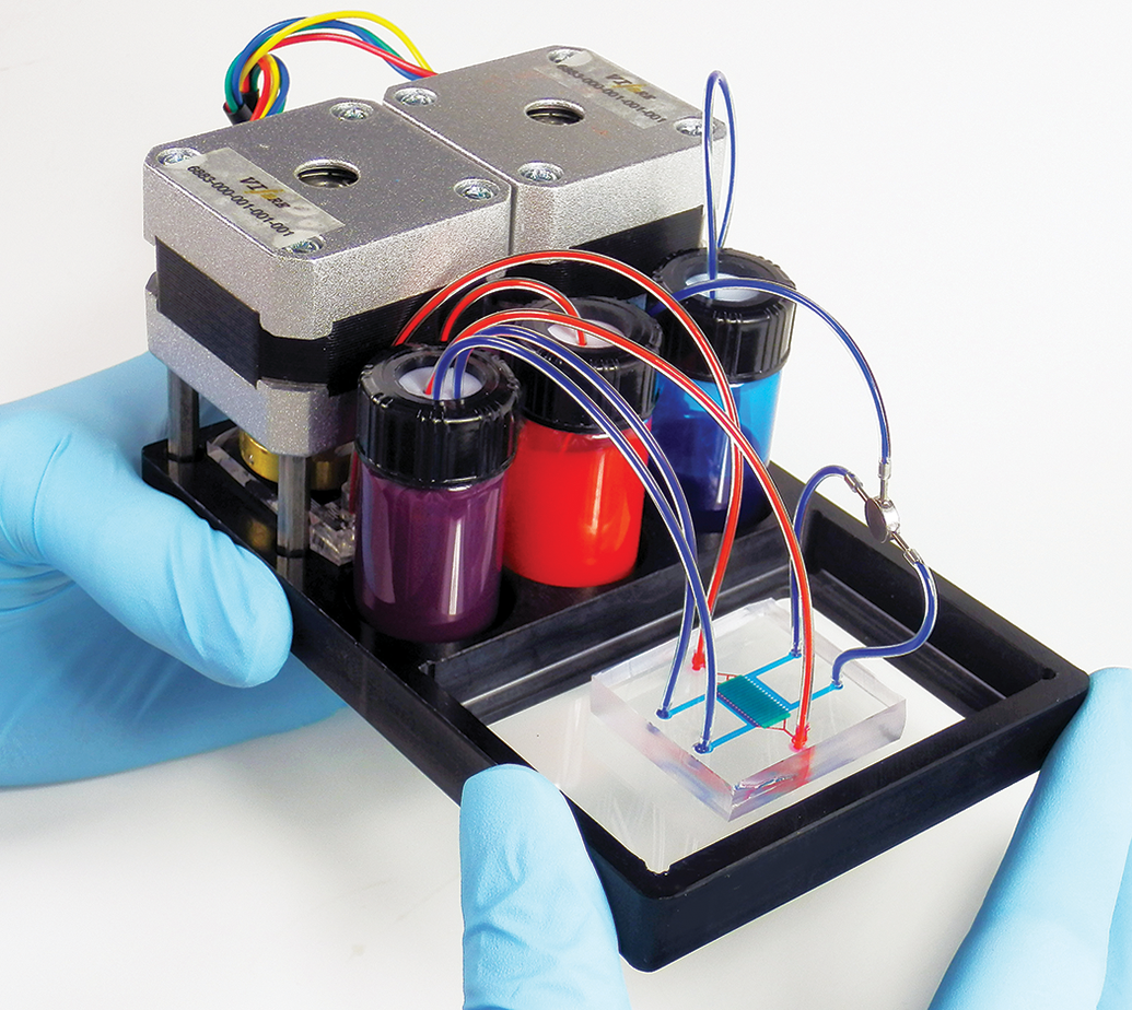 The microfluidics is designed to maintain a homeostatic and physiologic environment for the tissue or organ and works to control important factors such as oxygen tension, electrolyte balance, pH, and temperature. The tissue devices are formatted in such a way as to recapitulate the organ’s interaction with blood vessels, lymphatics, and muscle, bone, and connective tissue. Design elements are included that help imitate important functions of the tissue of interest such as the pumping action of the heart or the peristaltic movements of the intestine. Individual organs or tissues can be combined to form more complicated organ systems like the reproductive tract or cardiopulmonary system, and tiny sensors and controllers are used to orchestrate the system’s function or measure critical end points of interest. All of this is purposely designed to be scaled for enabling speed, reproducibility, and affordability (Figure 3).
