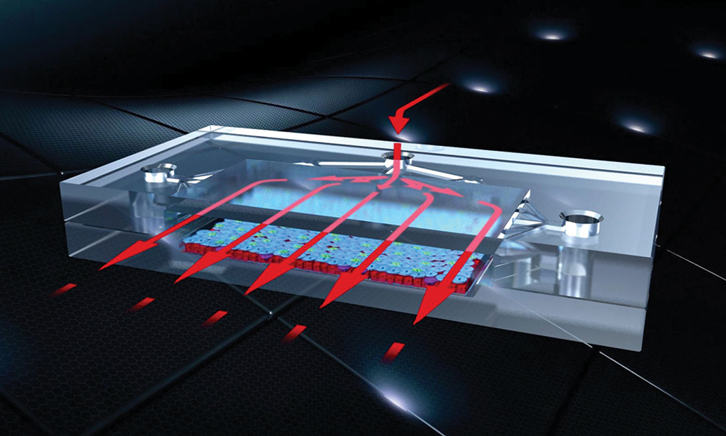 An example of a chip design for a microphysiological system which could be used for complex tissues or organs. Arrows show how fluids can move through the chip and mimic blood, lymph, or cerebrospinal fluid. Courtesy of the National Center for Advancing Translational Sciences.