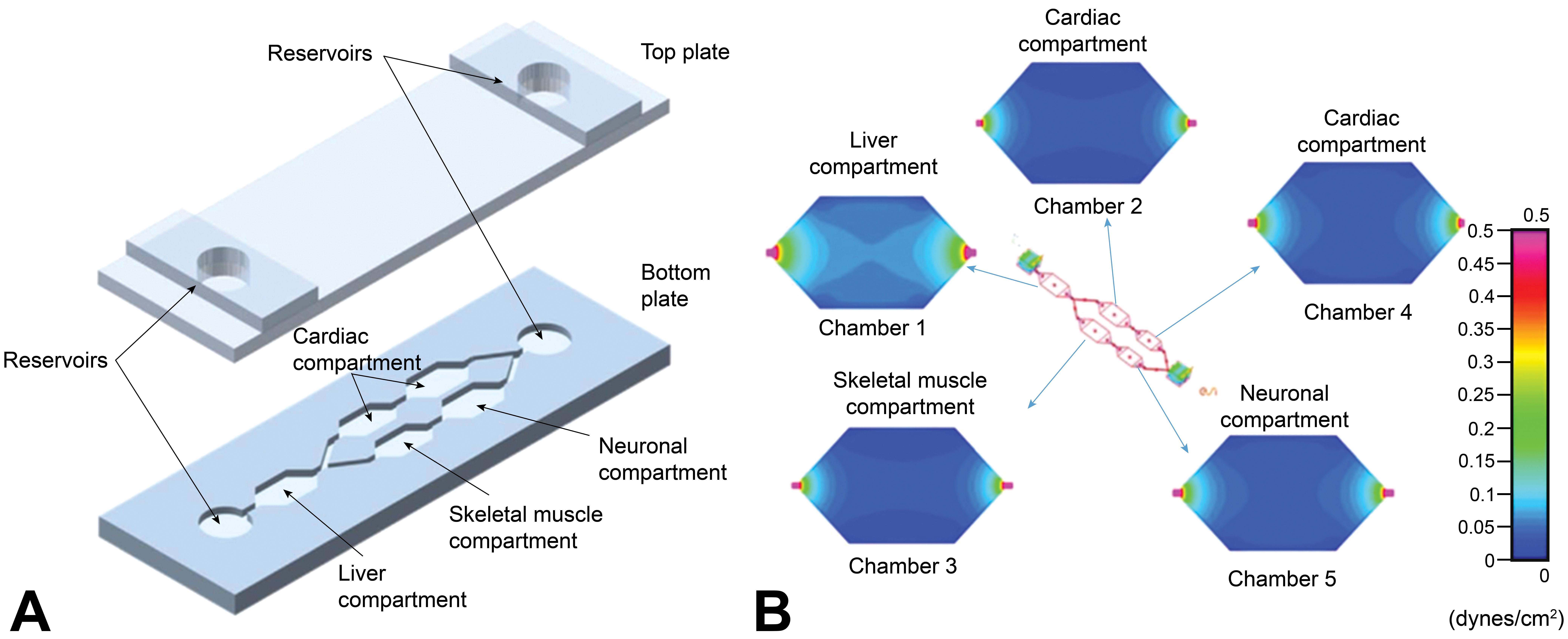 A diagram of the five human tissue microphysiological system platform used by Oleaga et al. (2016). A pumpless, gravity-based system (A) was used to simulate flow and shear stress (B) between the organs. The differential sheer stress across each organ in dynes/square centimeter is indicated by the different colors. Reproduced from Oleaga et al. (2016).