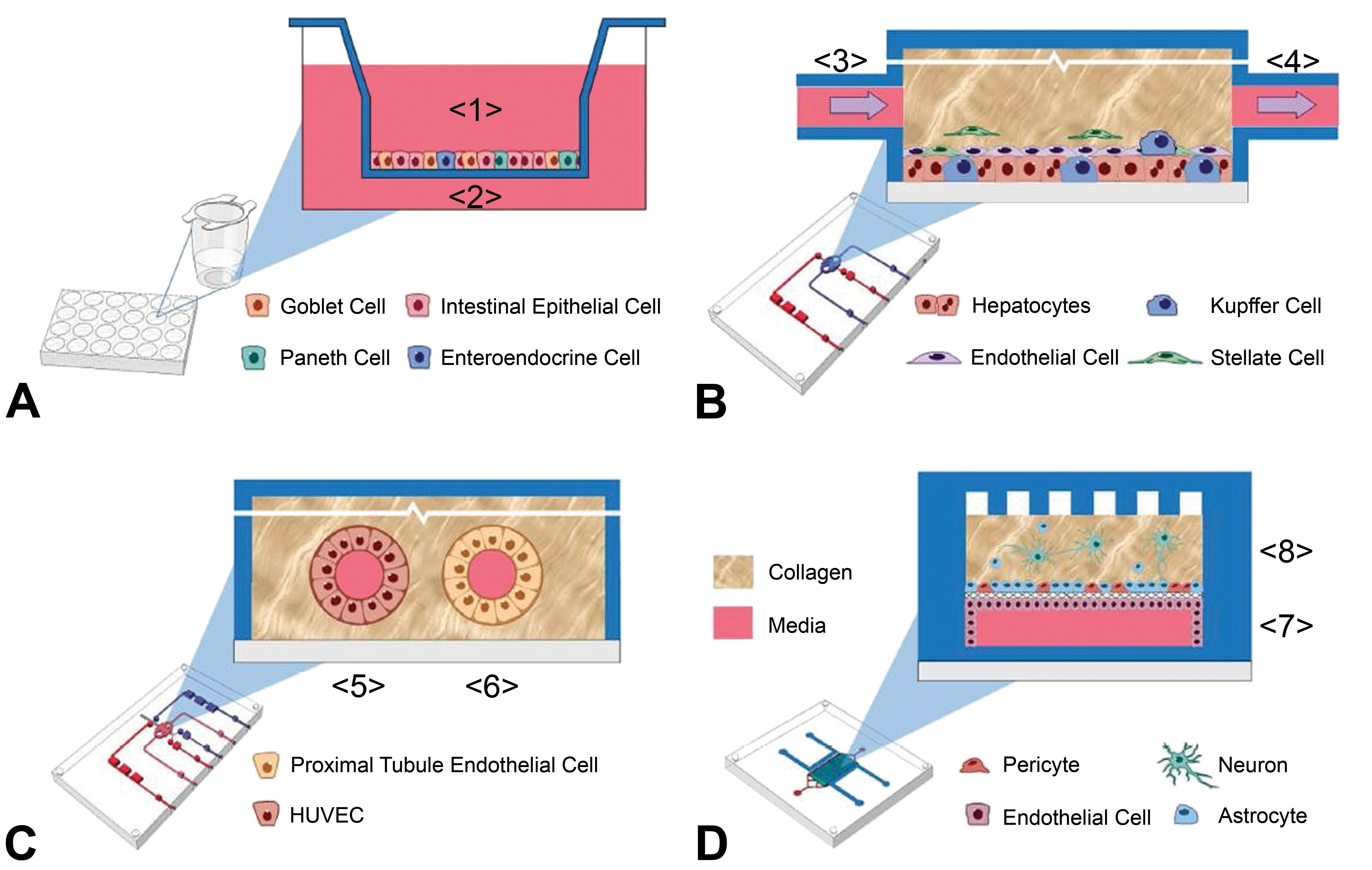 Illustration of the four human organ (intestine-A, liver-B, kidney-C, and brain-D) microphysiological systems (MPS) used by Vernetti et al. (2017) for functional MPS coupling and testing. Numbers 1 to 8 indicate the functional sequence of flow through the MPS. Reproduced from Vernetti et al. (2017).