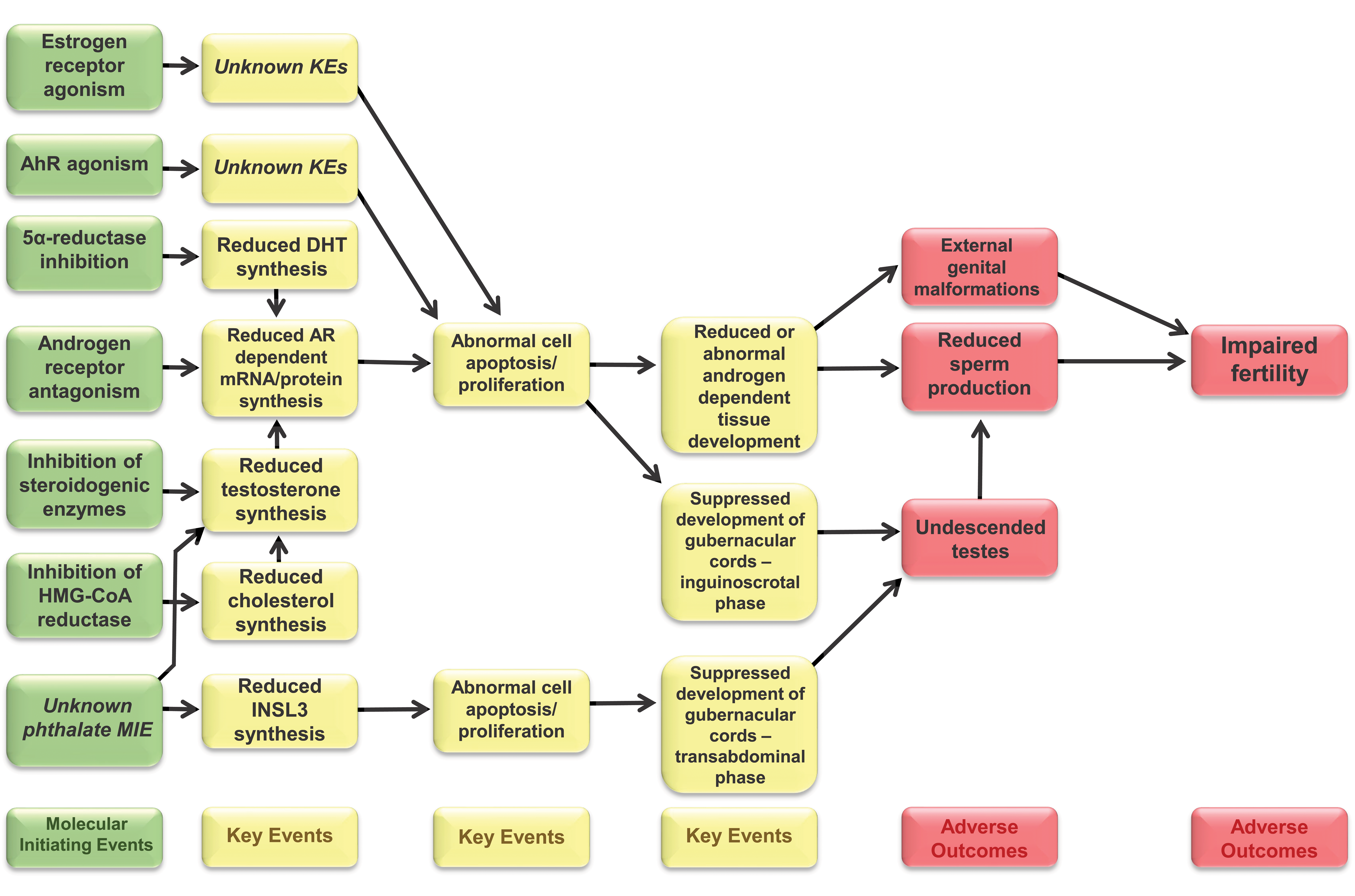 Adverse outcome pathway (AOP) network for chemicals that disrupt fetal development of the male reproductive tract. The predominant pathways include reduction in androgen receptor (AR)-dependent gene/protein expression; however, additional pathways including insulin-like hormone 3 (Insl3), estrogen receptor, and aryl hydrocarbon receptor (AhR) are known to adversely affect male development. DHT indicates dihydrotestosterone; HMG-CoA, 3-hydroxy-3-methyl-glutaryl coenzyme A; MIE, molecular initiating event.