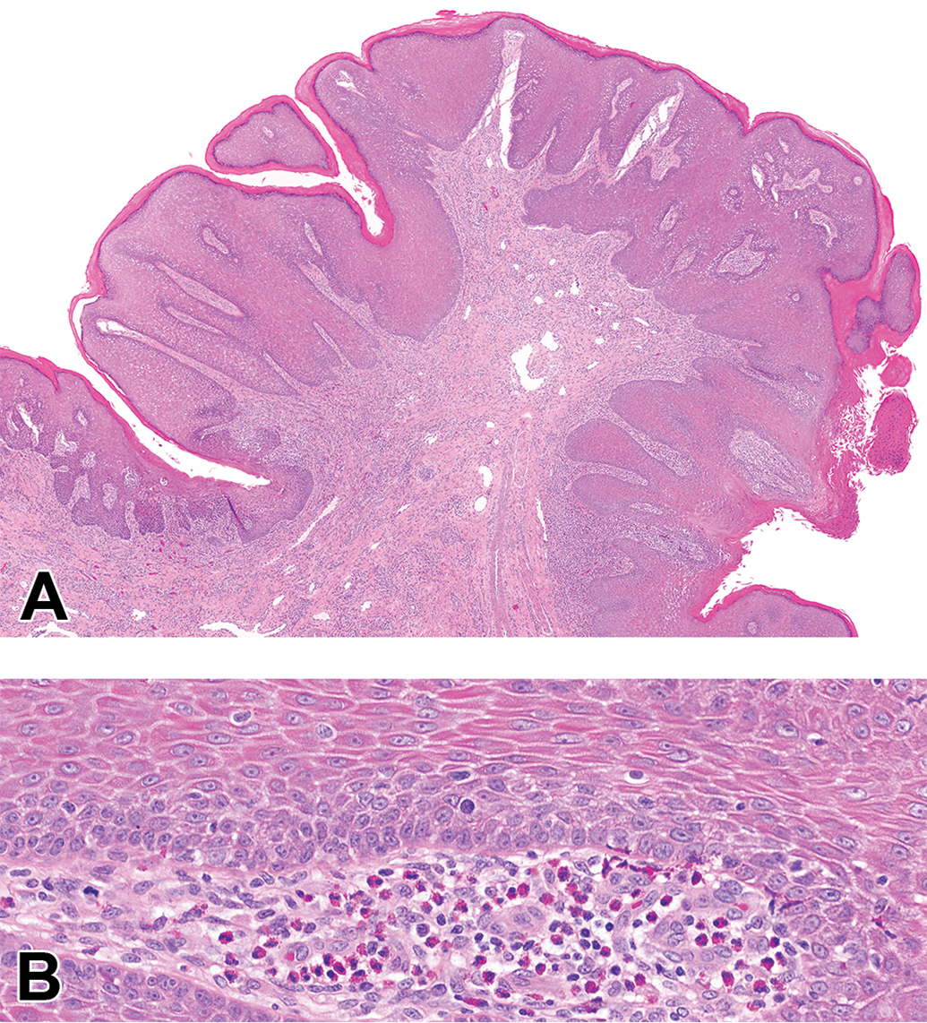 Proliferative lesions of the cervix and vagina most often occur near the squamocolumnar junction or transition zone of the cervix and are usually associated with papillomavirus infection. 114 Lesions are focal or multifocal and may be warty and exophytic, plaque-like, or endophytic. Histologically, lesions consist of varying mixtures of basal cell hyperplasia, koilocytic change, anisokaryosis, and atypia (Figure 9). Papillomavirus lesions may progress to invasive squamous cell carcinoma. 113 In addition to papillomavirus-associated lesions, a condylomatous lesion of the external genitalia has been identified in cynomolgus macaques of Mauritian origin; this lesion is not associated with papillomavirus infection and lacks dysplasia and atypia. Distinguishing hallmarks of this entity are exophytic growth, regular hyperplasia of the stratified squamous mucosa, and eosinophilic inflammation of the mucosa and superficial submucosa (Figure 10). 115
