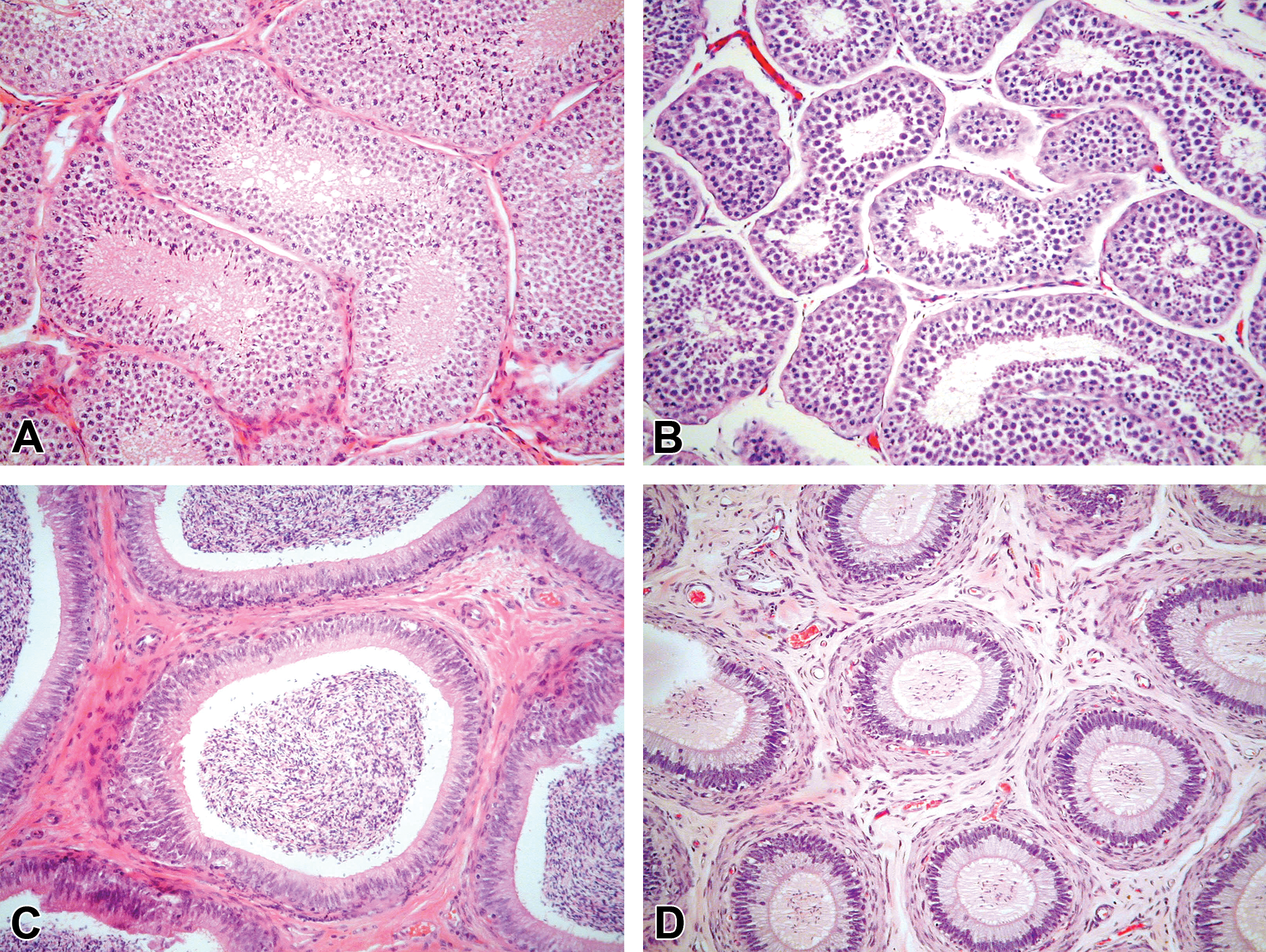 Seasonal testicular atrophy in rhesus macaques. A, Normal testis, winter. B, Testicular atrophy, summer. C, Normal epididymis, winter. D, Hypospermia, summer.