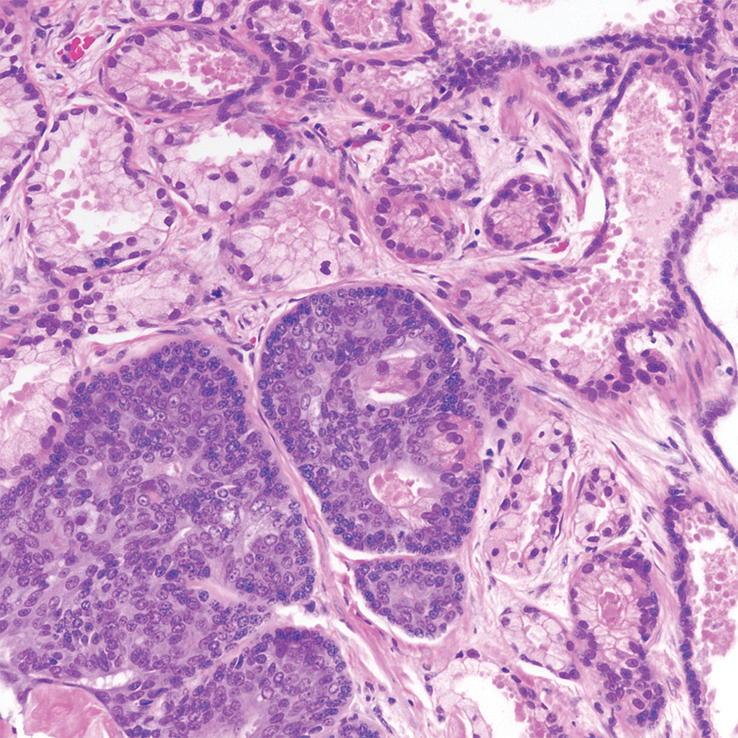 Prostatic basal cell hyperplasia in a cynomolgus monkey. Hyperplastic glands are on the lower leftside of the image and consist of basophilic, multilayered to solid, small,polygonal cells with scant cytoplasm filling the glands, in contrast to thesingle-layered, simple columnar epithelium of adjacent normal glands.