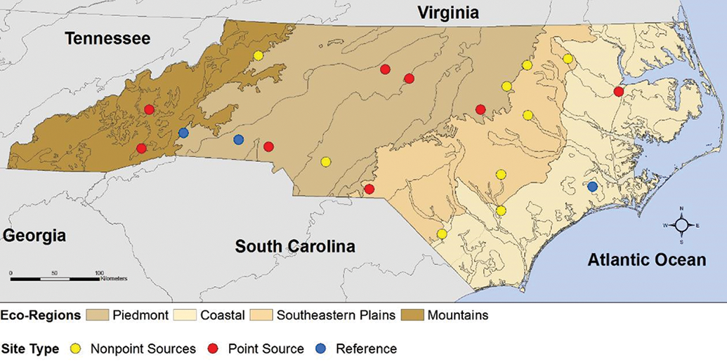 Study site map, state of North Carolina. Collection sites were selected as follows: 8 point sources (red), defined by direct discharge into water; 9 nonpoint sources (yellow), with indirect diffusion into water; and 3 reference sites (blue), with no apparent discharge upstream. Up to 10 male black bass (