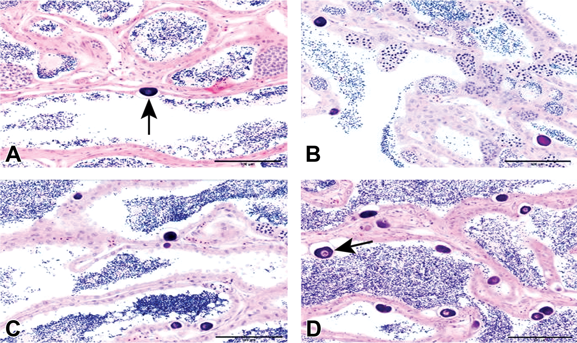 Representative cross-sections of testis from each fish were scored for intersex severity, using the method developed by Blazer et al. 138 Oocytes observed within the seminiferous tubules were predominantly in the previtellogenic, chromatin nucleolus stage (arrows). A, Severity rank 1, single oocyte observed at ×10 objective magnification. B, Severity rank 2, more than 1 oocyte per field of view, but oocytes not closely associated. C, Severity rank 3, 2 to 5 closely associated oocytes. D, Severity rank 4, clusters of more than 5 closely associated oocytes. Hematoxylin and eosin staining.