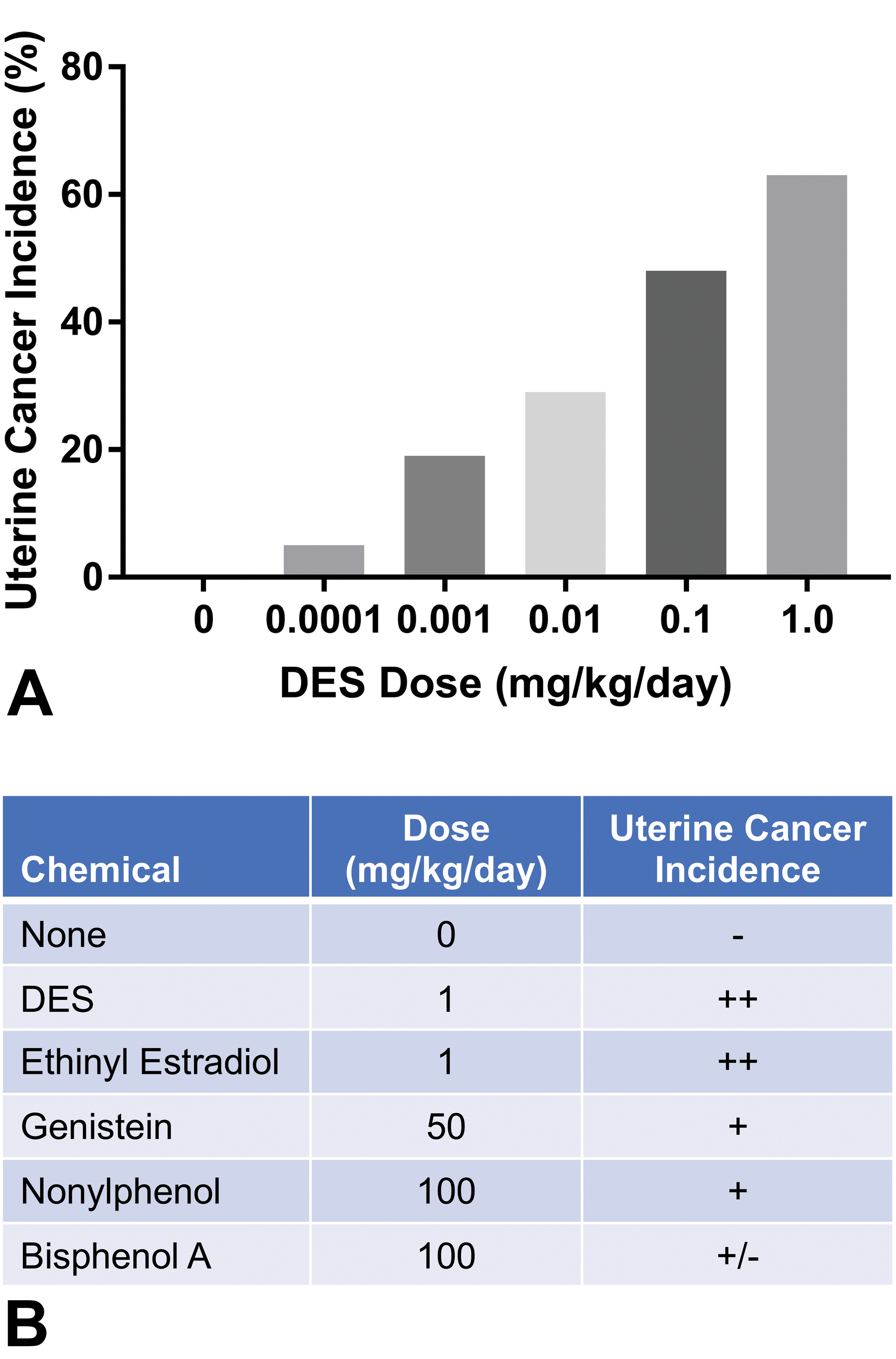 Diethylstilbestrol (DES) as a model for weaker environmental estrogens. Mice were treated on neonatal days 1 to 5 with increasing doses of DES (panel A) or environmental chemicals (panel B) and uterine adenocarcinoma incidence determined at 12 months of age.
