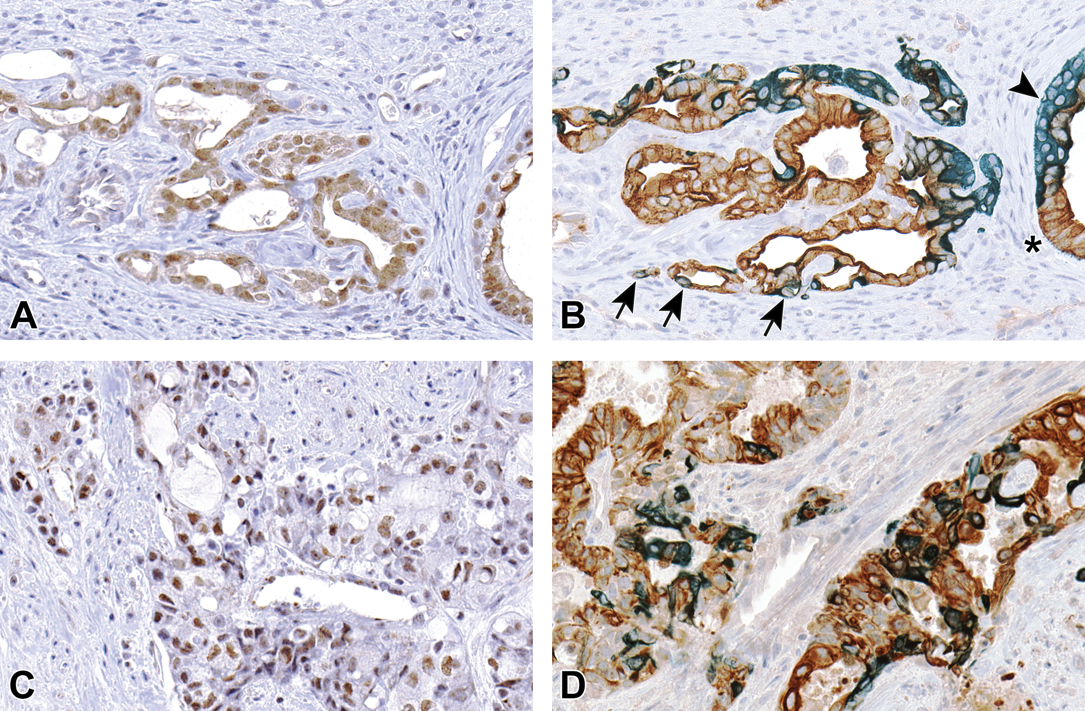 Aberrant cell types in mouse and human uterine carcinoma. A and B, Uterine adenocarcinoma lesion from an 18-month-old mouse that was neonatally exposed to GEN. Abnormal cells uniformly express Six1 (panel A) and have luminal (CK18, brown, asterisk), basal (CK14, teal, arrowhead), or mixed (CK14/CK18 coexpression, forest green, arrows) features based on morphology and dual CK14/CK18 labeling (panel B). Images show serial sections. C and D, Human uterine carcinoma with Six1 expression (panel C) and cells coexpressing CK14 and CK18 embedded within the neoplastic lesion (panel D). Images shows cells within the same region, but are not serial sections. All slides were immunostained for Six1 or doubled immunostained for CK14 and CK18. Original objective ×40. CK indicates cytokeratin; GEN, genistein; Six1, sine oculis homeobox transcription factor 1.