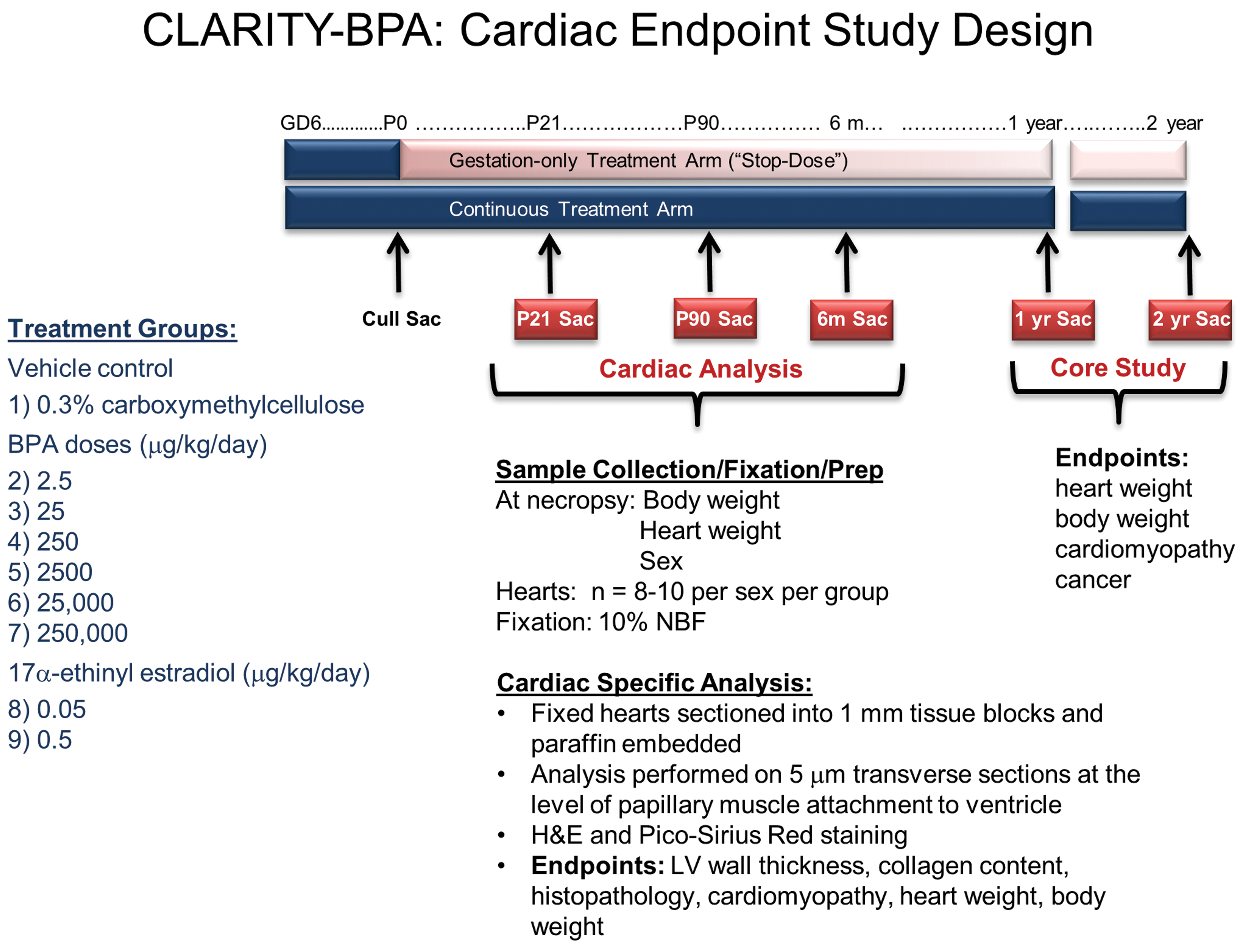 The CLARITY-BPA study design. The CLARITY-BPA study design is shown graphically with dosing initiated at GD6 through PND21 (stop-dose) or continuously until the indicated time of sacrifice (sac) and tissue collection. CLARITY-BPA indicates Consortium Linking Academic and Regulatory Insights on BPA Toxicity; GD, gestational day; LV, left ventricle; PND, postnatal day; Sac, sacrifice/necropsy.