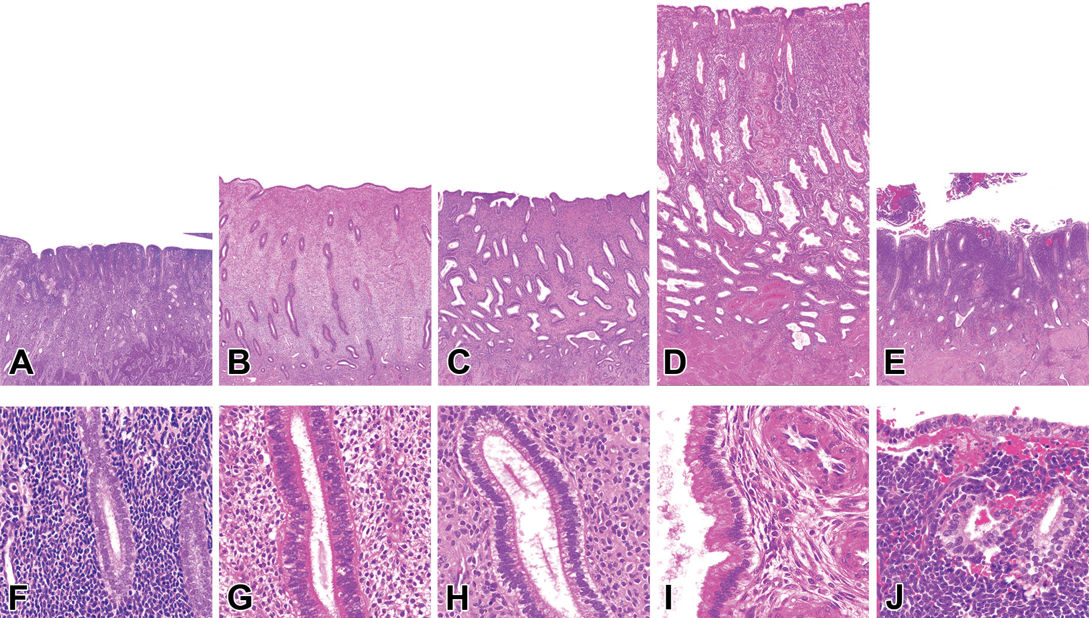 Normal endometrial histology of the cynomolgus monkey. A and F, Atrophic endometrium, with sparse straight glands, cuboidal glandular epithelium, and compact stroma. B and G, Follicular-phase endometrium, with pseudostratified glandular epithelium, and straight to slightly coiled glands in an edematous stroma. C and H, Periovulatory endometrium, with distinct subnuclear vacuoles. D and I, Luteal-phase endometrium, with saw-toothed glands and prominent spiral arteries. E and J, Menstrual phase, with compact stroma, sloughing, hemorrhage, and apoptosis.