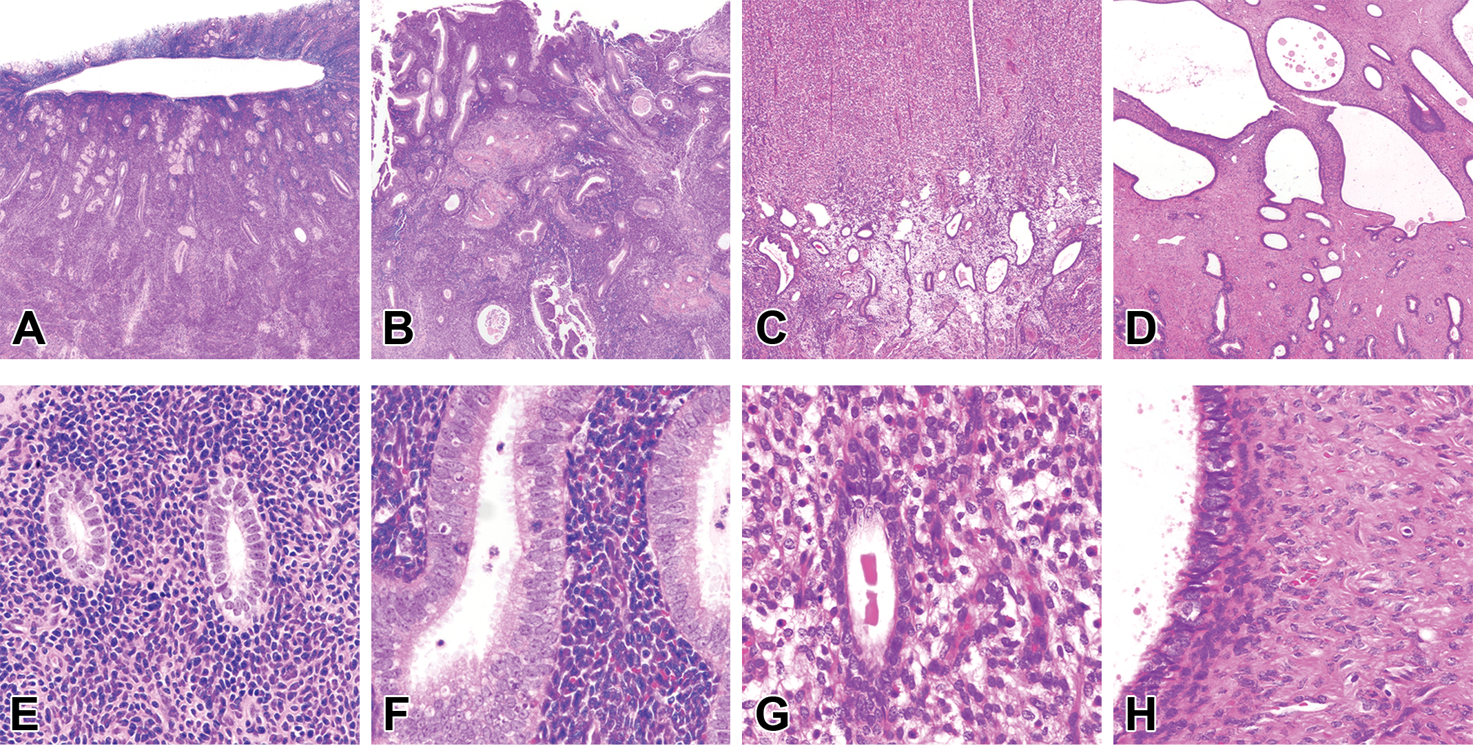 Histologic changes characteristic of estrogens, progestogens, and selective estrogens in the endometrium of cynomolgus monkeys. A and E, Ovariectomy-induced endometrial atrophy. B and F, Estrogen-induced irregular endometrial glandular hyperplasia. C and G, Estrogen- + progestogen-induced glandular atrophy, stromal hyperplasia, and infiltration by endometrial granular leukocytes. D and H, Stromal fibrosis and cystic change induced by a selective estrogen (tamoxifen).
