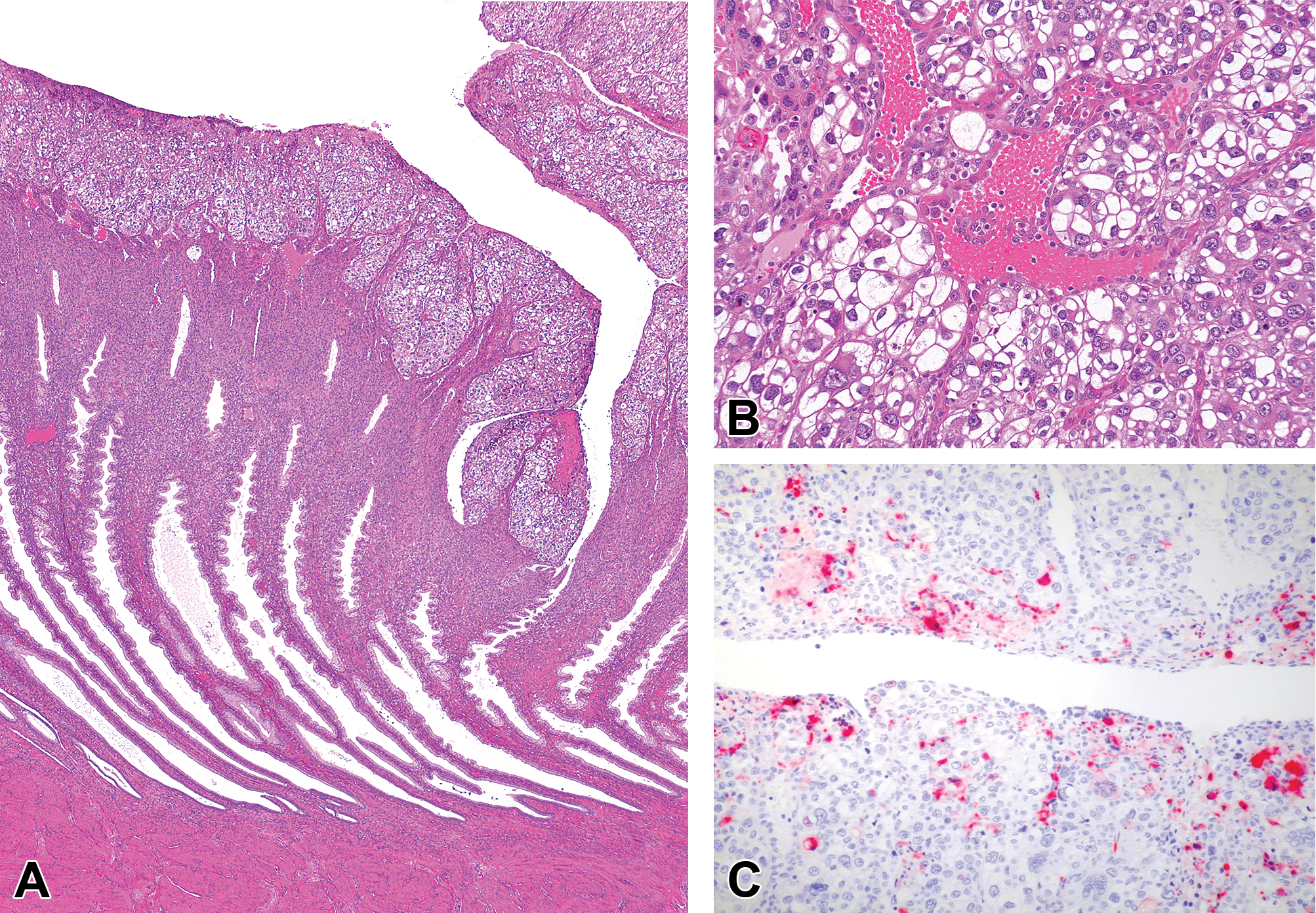 The epithelial plaque response in the endometrium of a cynomolgus monkey (reprinted with permission from Cline et al 74 ). This lesion occurs in the luteal phase of thecycle and is an incidental finding. A, a plaque of endometrial surfaceepithelium covering most of the luminal surface, with “saw-toothed”luteal-phase endometrial glands in the deeper endometrium. B, highermagnification of epithelial plaque cells, showing large round to polygonalcells with clear cytoplasm surrounding a blood vessel. C, immunohistochemicalstaining for cleaved caspase 3, indicating apoptosis.