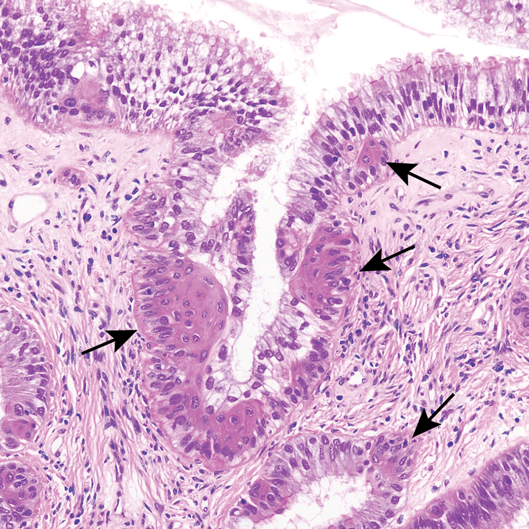 Squamous metaplasia of the endocervix in a cynomolgus monkey. This benign lesion is induced by physiologic or pharmacologic estrogens. Arrows indicate nests of squamous cells beneath the normal pseudostratified columnar ciliated epithelium of the endocervix.
